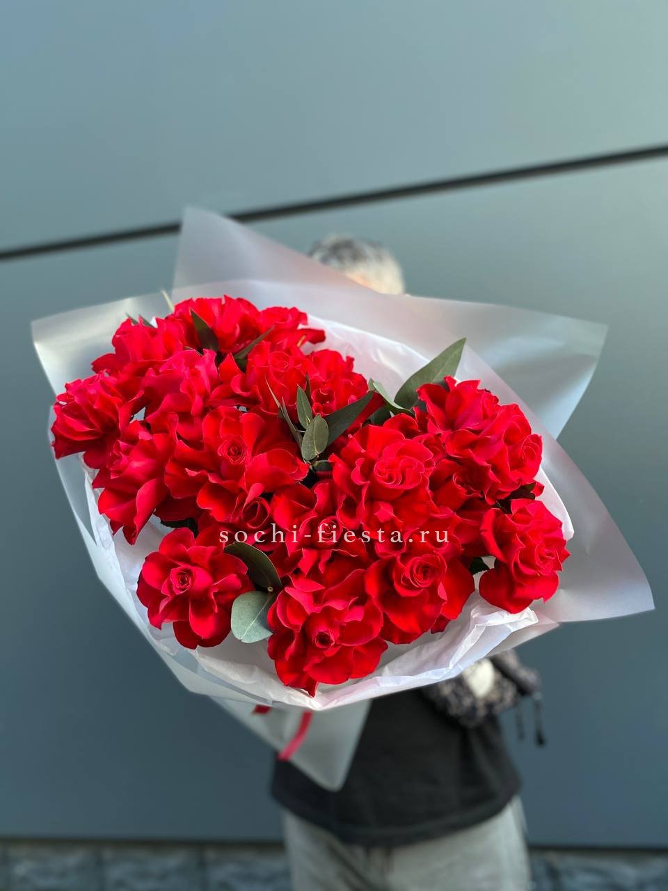 Тридцать семь роз раскрываются пышной шапкой глубокого красного оттенка. Бутоны плотно прилегают друг к другу, создавая объемную текстуру. Композиция звучит насыщенно и уверенно.