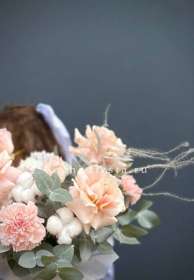 Пышная композиция из одноголовых и кустовых роз в дизайнерской пленке. Эвкалипт добавляет графичности, а лента завершает образ.