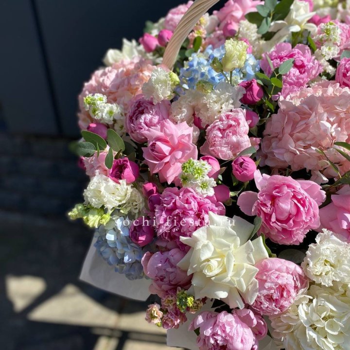 пионовый авторский букет гигант из 60 крупных пионов для майской свадьбы или юбилея в небольшом городе корзина-гигант из сезонных цветов от местного флориста для открытия бизнеса или торжественного поздравления
