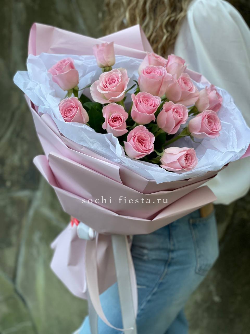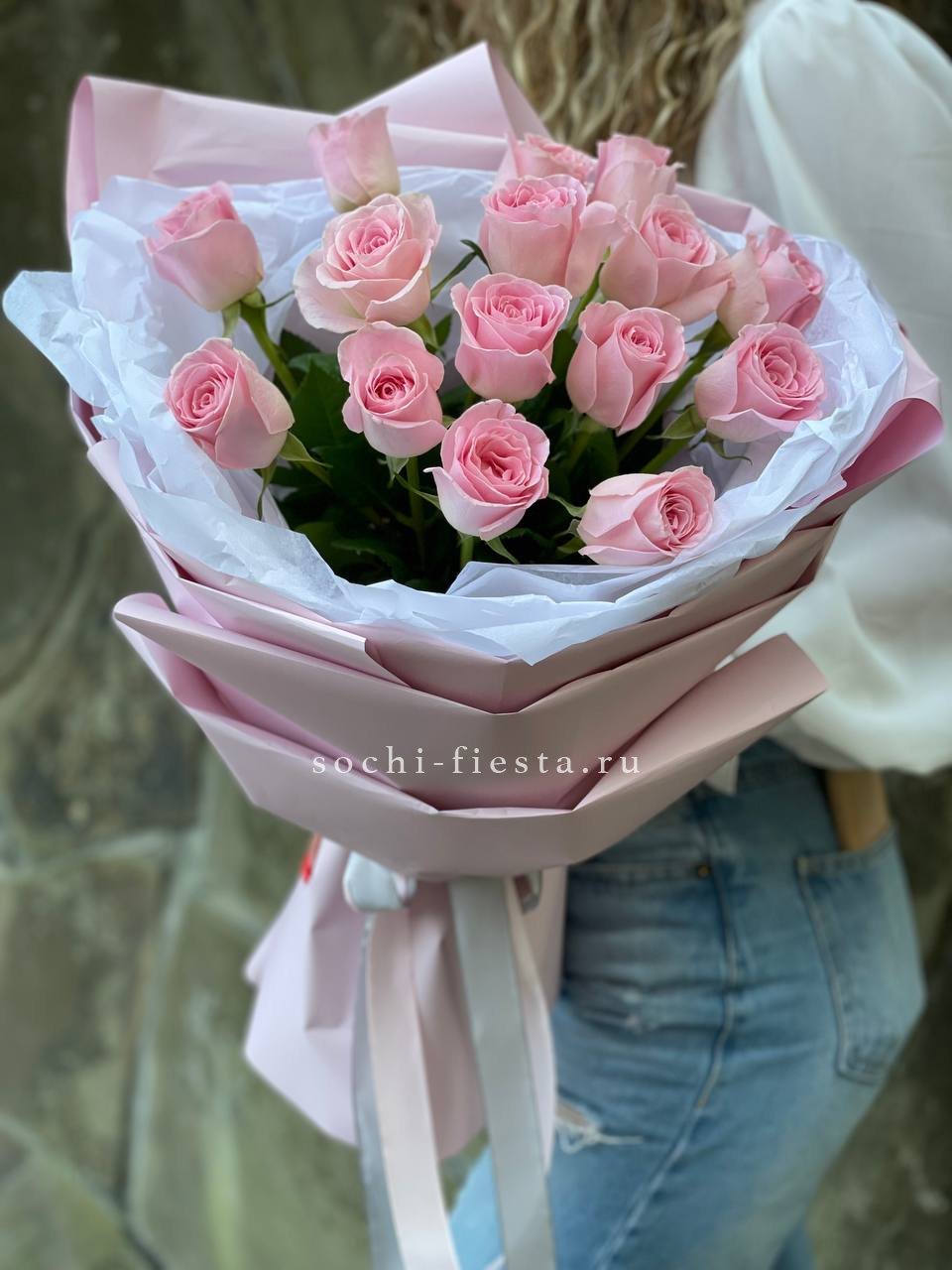 Пятнадцать белых роз в дизайнерской бумаге создают мягкий графичный силуэт. Бутоны собраны плотно с сохранением естественного ритма и воздуха между ними.