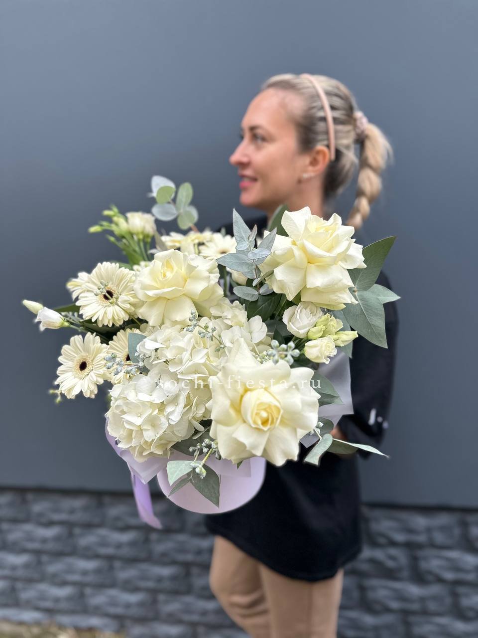 Эта роскошная композиция в модной упаковке объединяет благородные цветы с разными текстурами, создавая многогранный и богатый образ. Деликатные оттенки символизируют утонченность, элегантность и безупречный вкус. Букет подчеркнет индивидуальность дарителя и станет незабываемым акцентом любого торжества.
