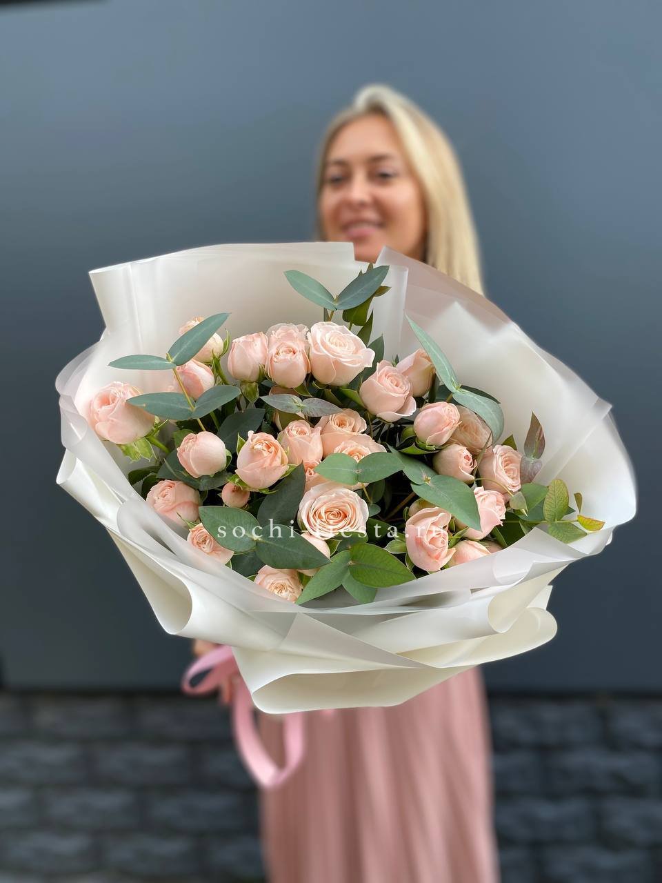 Этот букет — словно облако нежности и мечтательности. Бутончики кустовых роз, напоминающие тугие шарики, имеют светлый кремовый цвет с легким розовым оттенком. В сочетании с веточками свежего эвкалипта они создают атмосферу легкости и романтики. Это идеальный подарок для выражения самых светлых и теплых чувств, который растопит любое сердце.