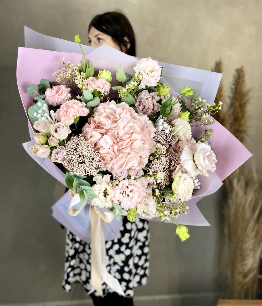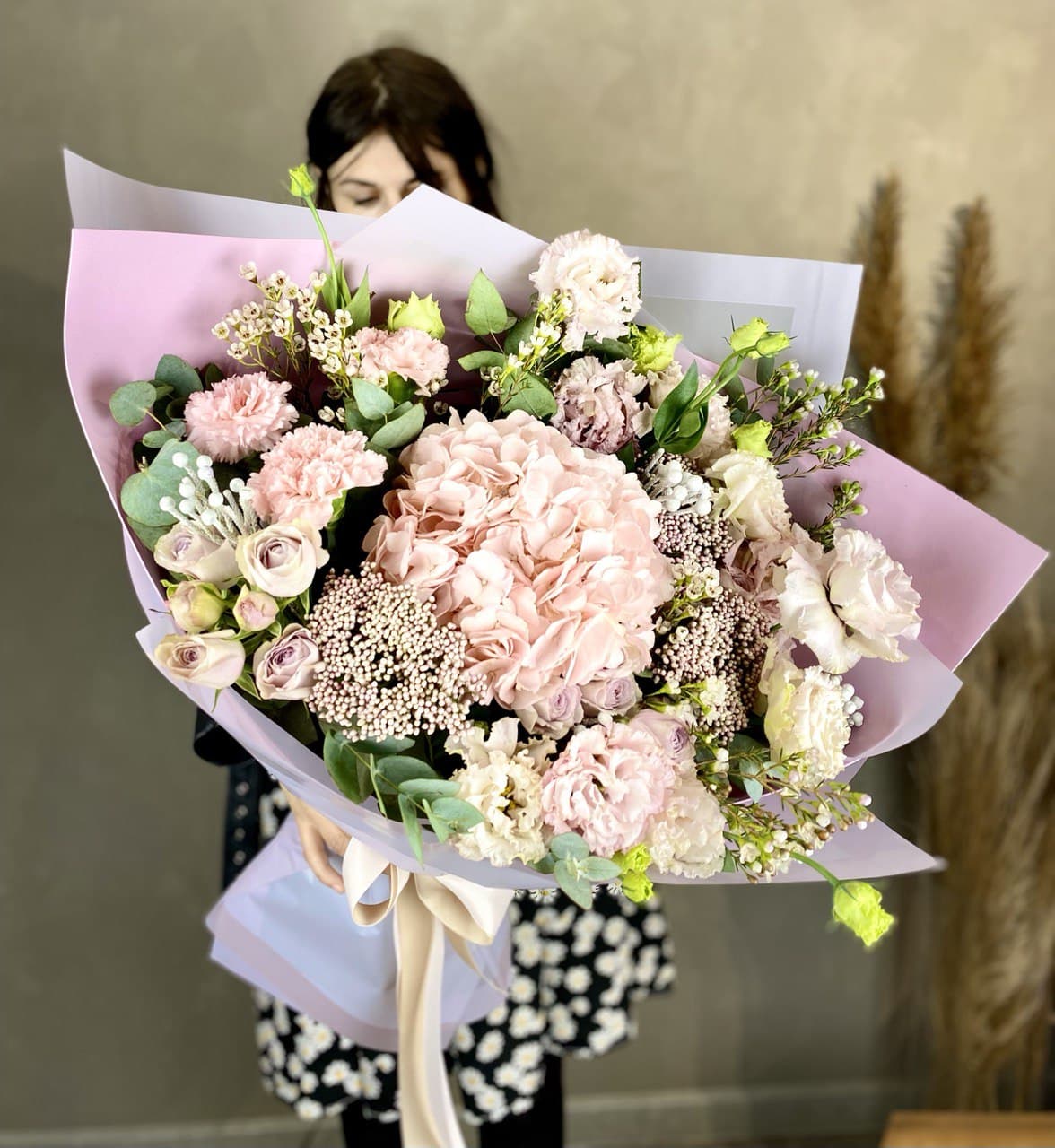 Розовые розы раскрываются среди воздушных соцветий гортензии и мелких бутонов диантуса. Озотамнус добавляет композиции лёгкость и объём. Букет собран плотно и держит форму без лишних деталей.