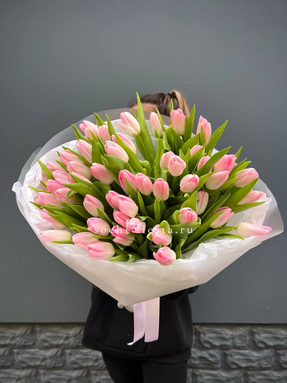 Пышная охапка из полусотни тюльпанов создает объемное облако цвета. Бутоны собраны плотно, образуя живую скульптуру с мягким розовым свечением. Такая композиция меняет восприятие пространства вокруг.