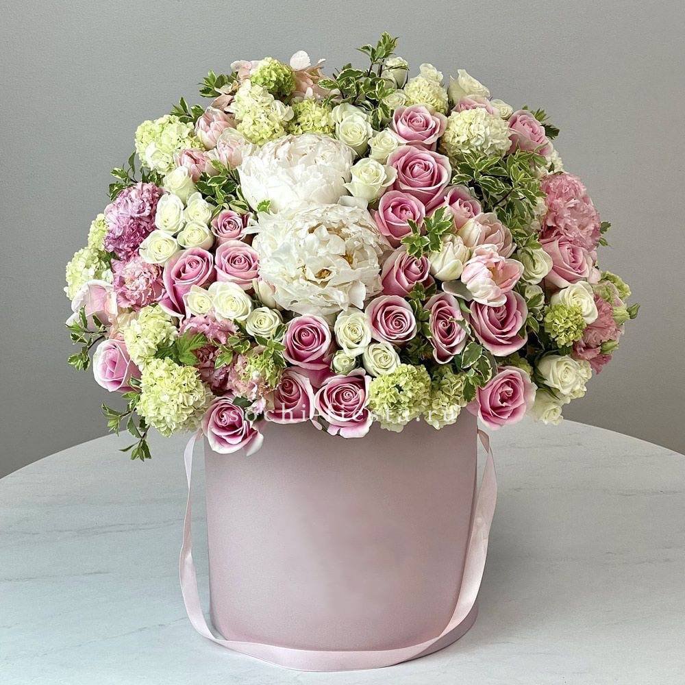 Двадцать девять соцветий гортензии образуют воздушное облако пастельных оттенков. Объёмная композиция заполняет пространство мягкими полусферами и создаёт ощущение летней прохлады в любом интерьере.