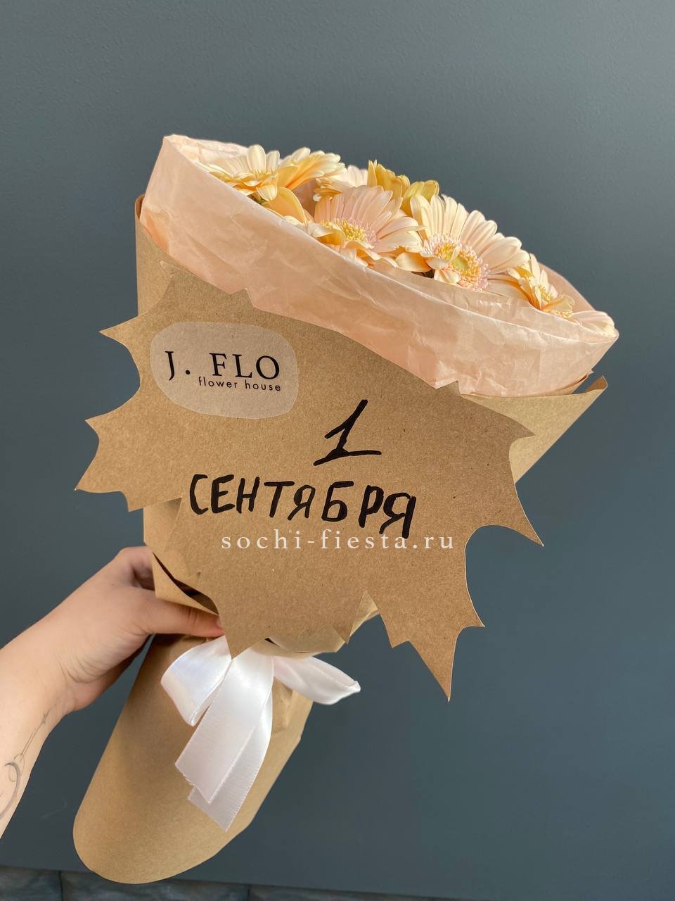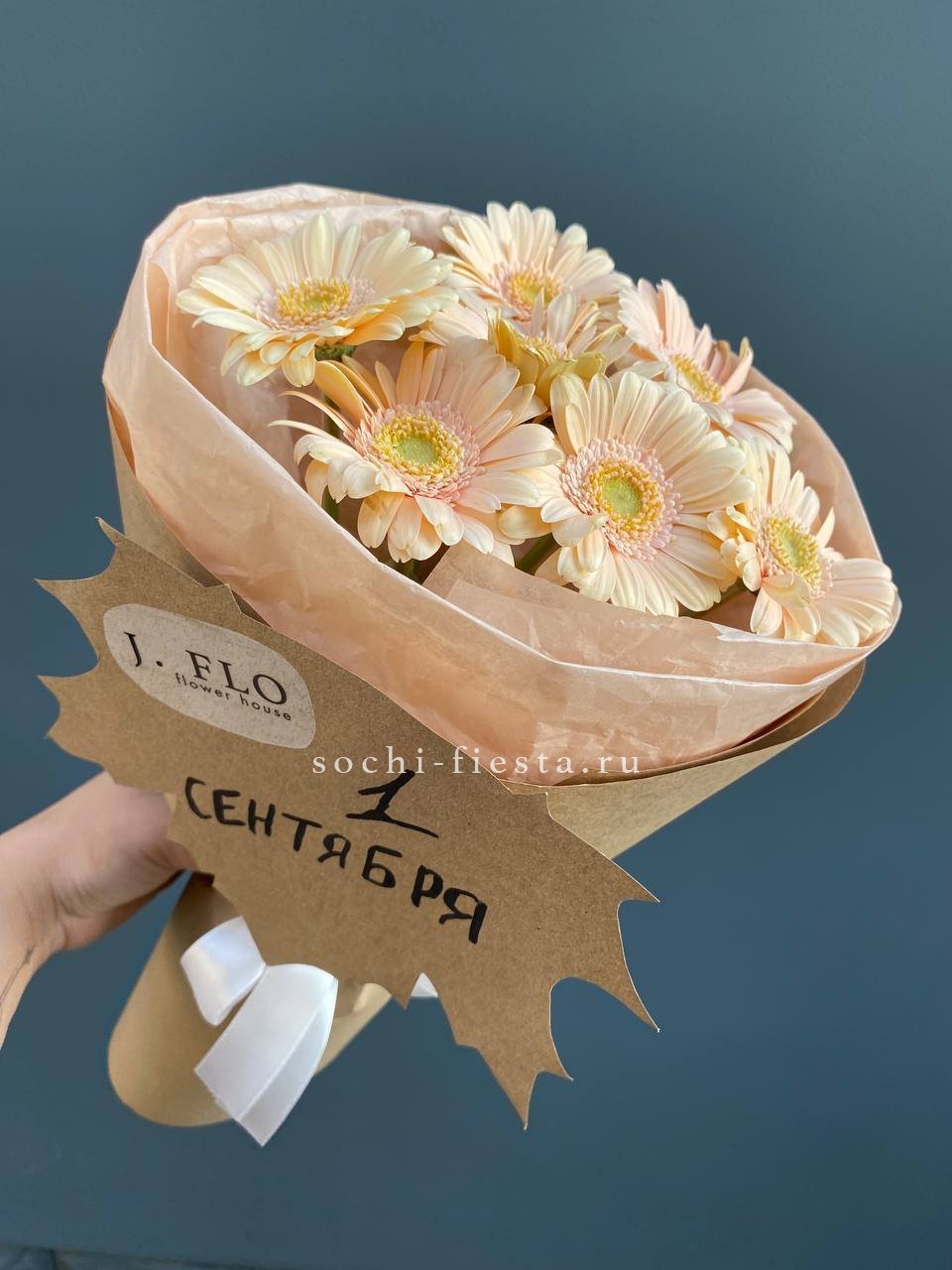 Семь ярких гербер собраны в компактную форму и упакованы в натуральный крафт с тишью. Цветные головки создают праздничное настроение первого учебного дня.