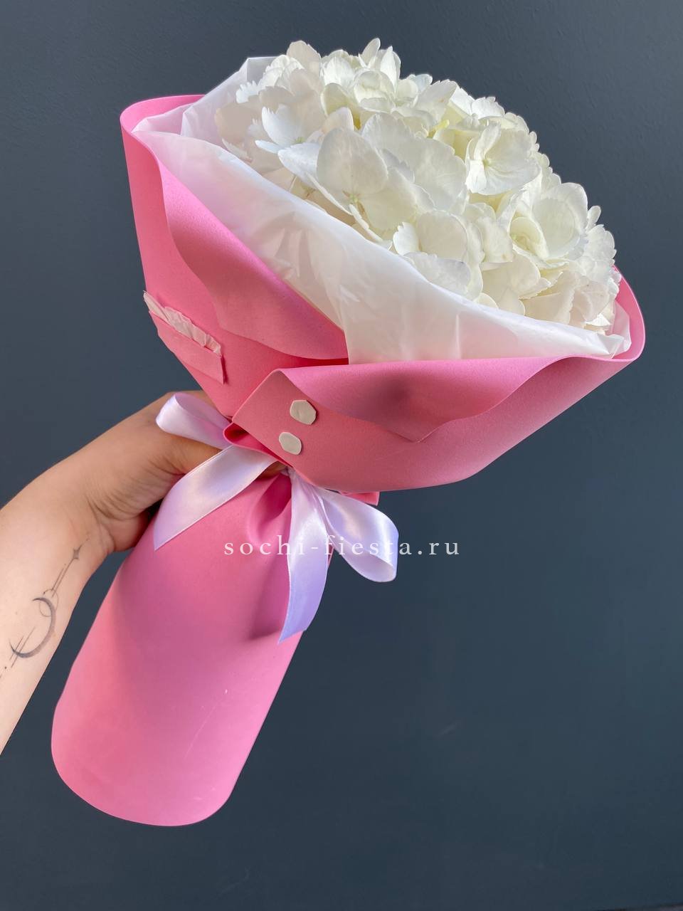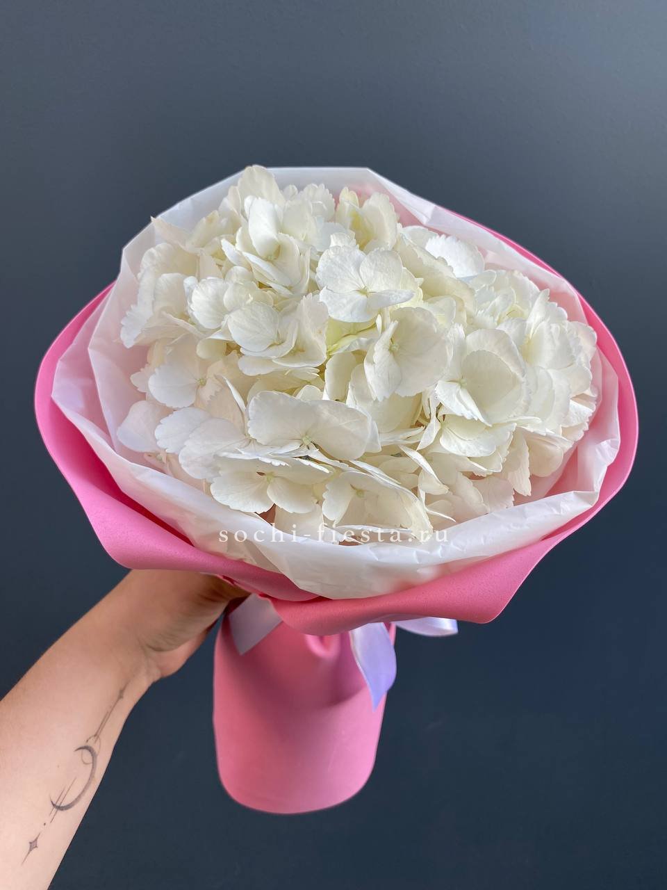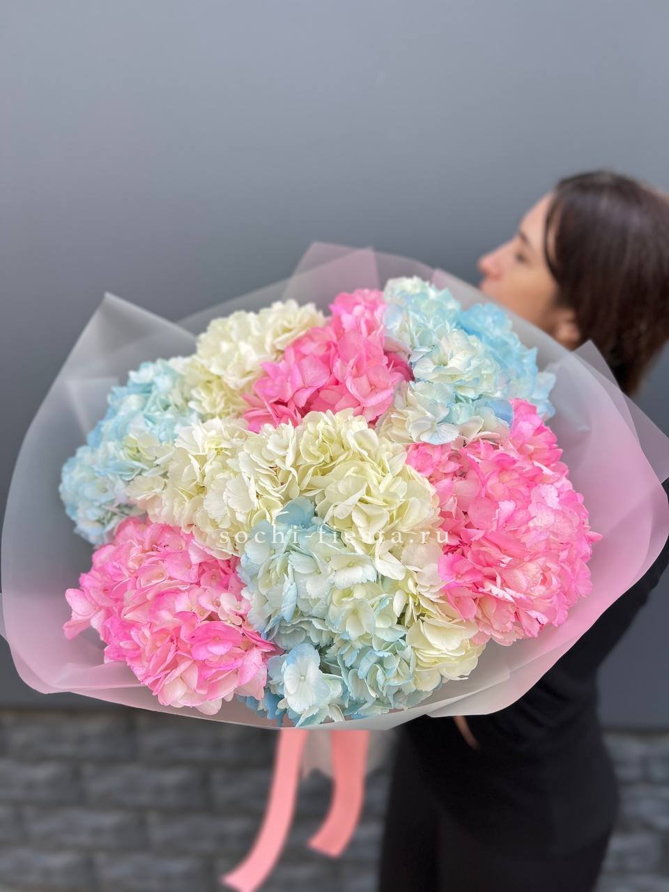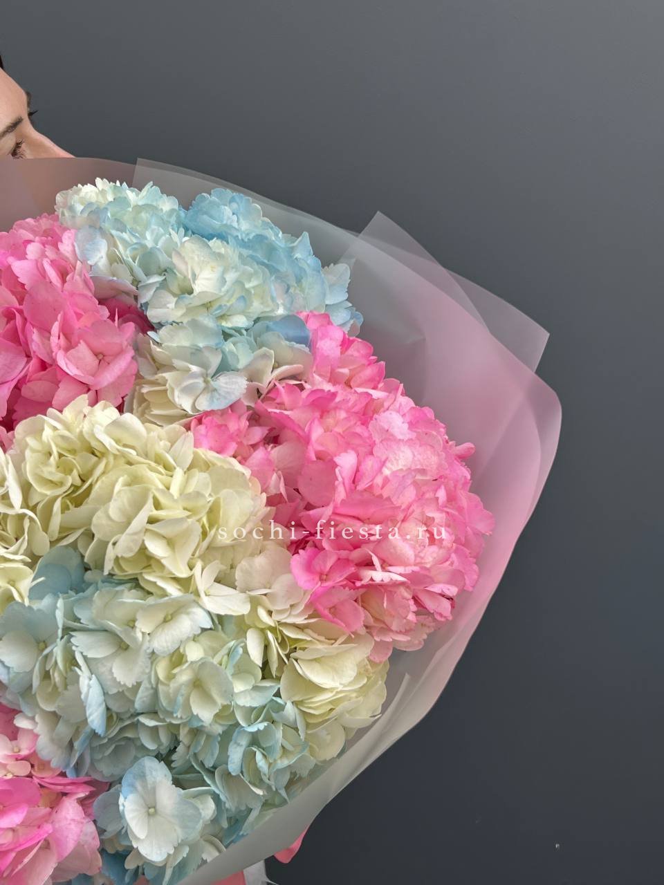 Двадцать одна гортензия разных оттенков собрана в пышную охапку с мягкими переходами цвета. Шаровидные соцветия создают плотную текстуру, а их природная стойкость позволяет наслаждаться букетом долго.