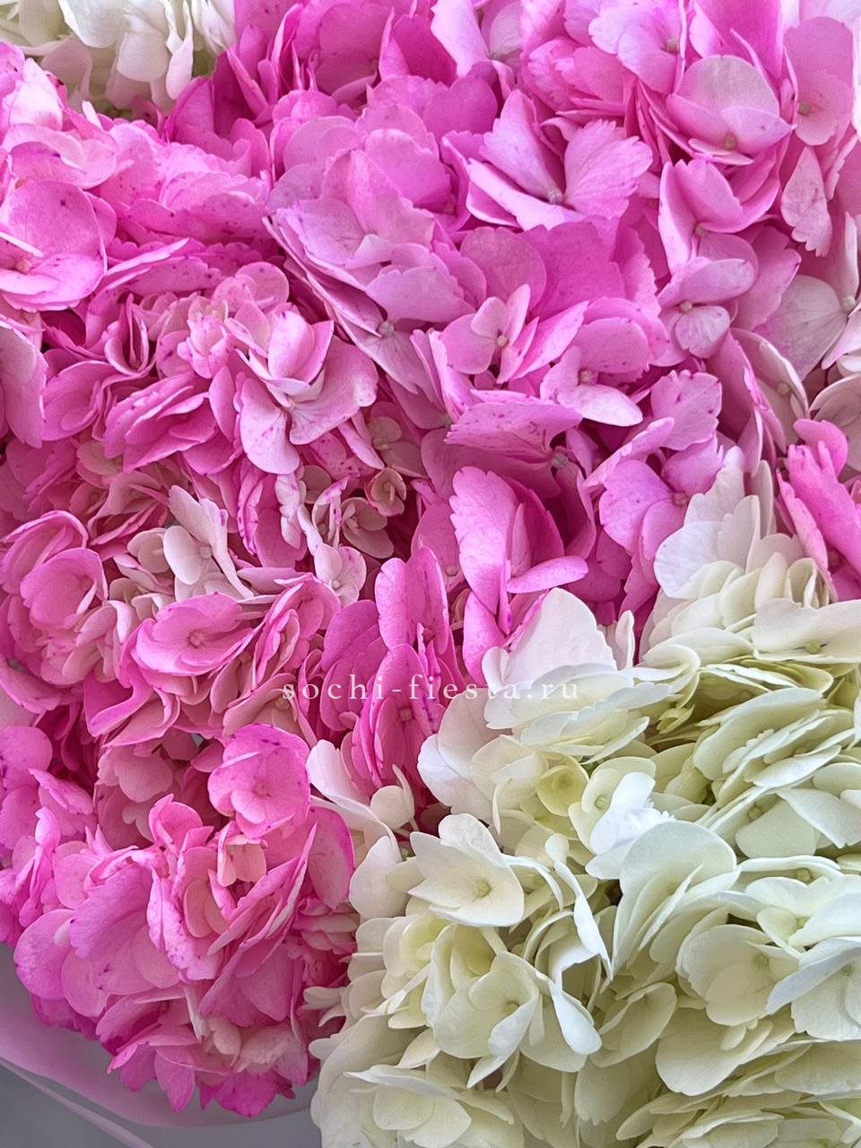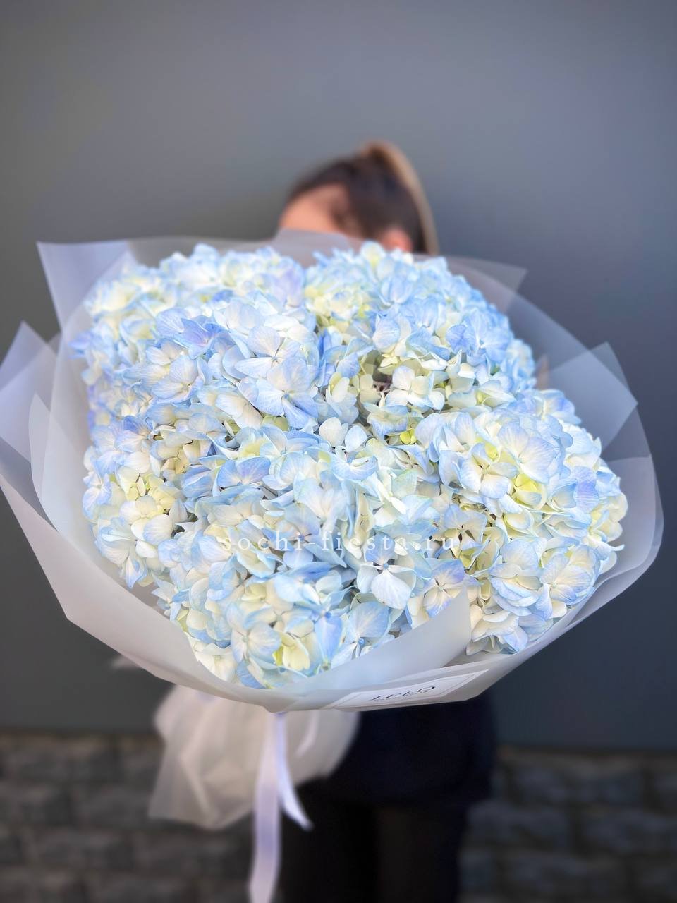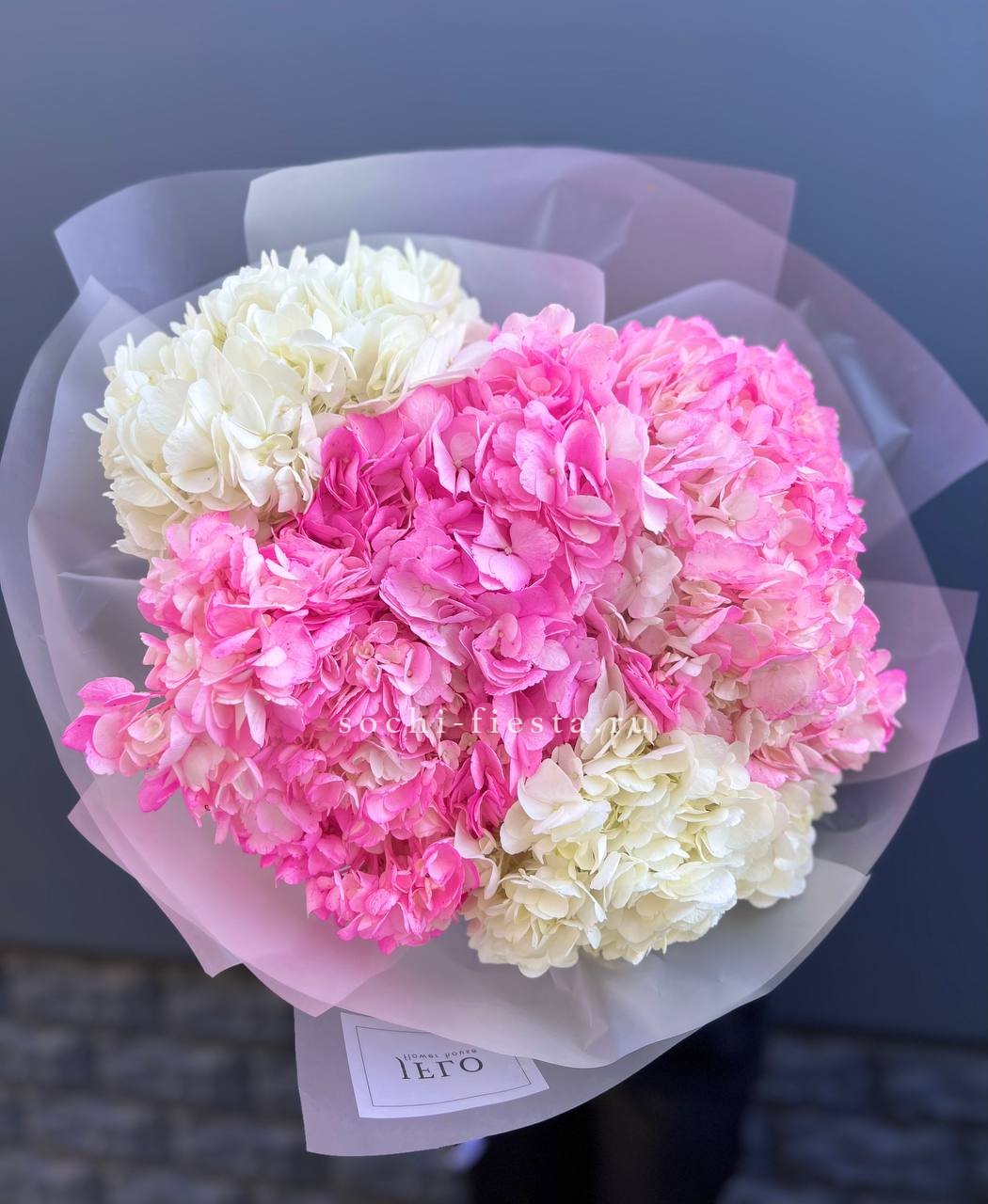 гортензия, лента, зелень по наличию, дизайнерская упаковка.