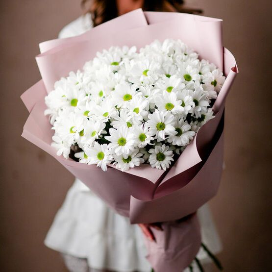 Девять кустовых хризантем сплетаются с пушистыми колосками лагуруса в воздушную композицию. Мягкие текстуры и природная простота создают ощущение прогулки по летнему полю.