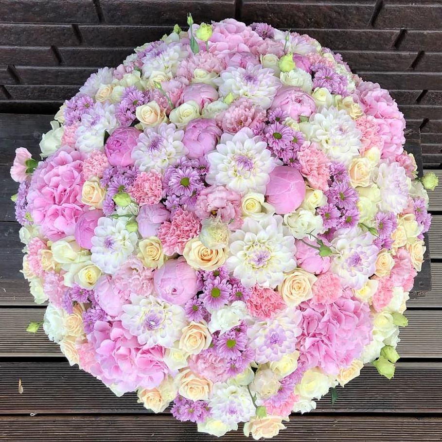 Сто один пион сортов Сара Бернар и Дюшес создают монументальную композицию с мощным присутствием. Бутоны разной степени раскрытости формируют живую текстуру. Такой букет становится центром любого пространства.
