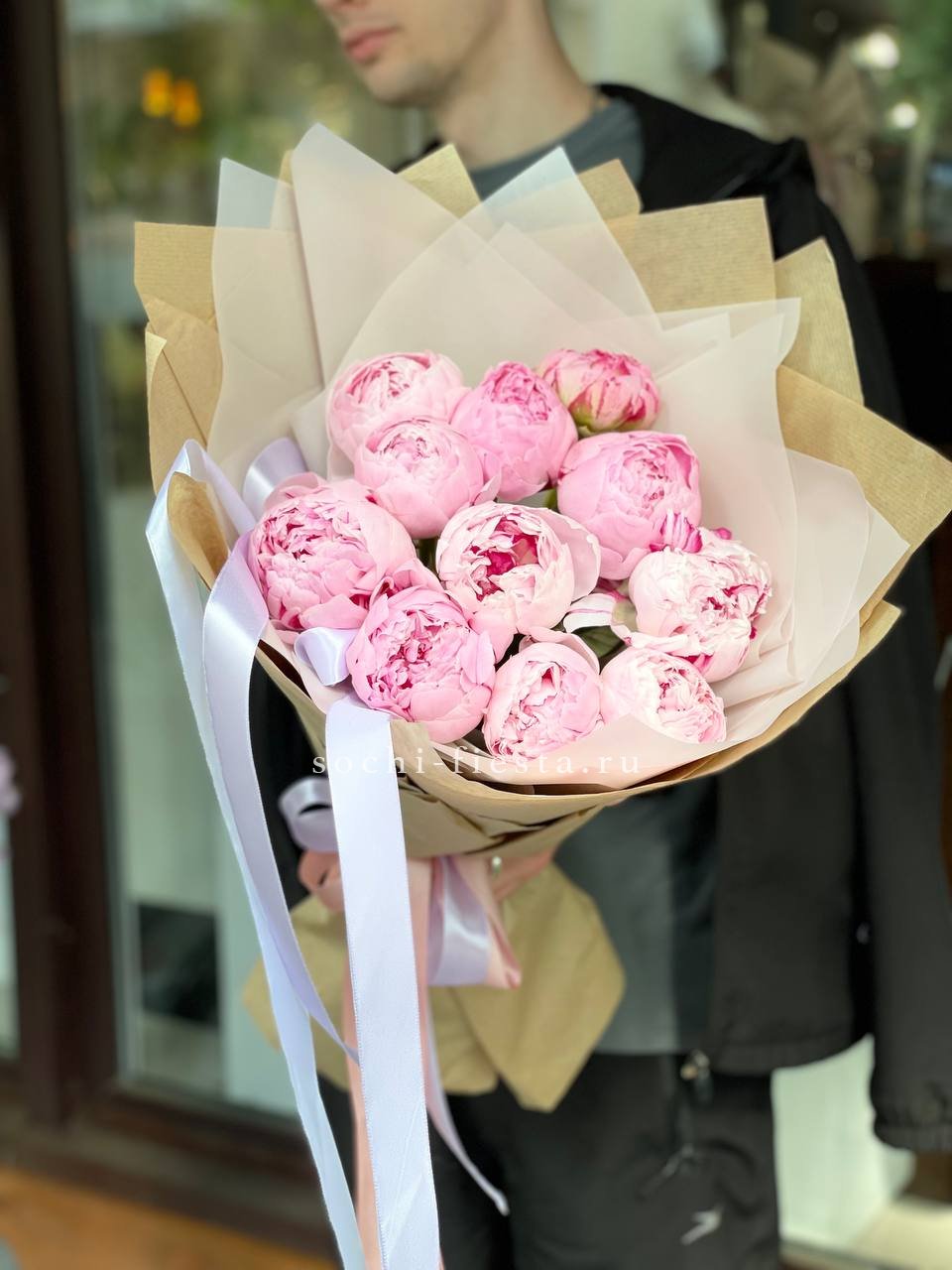 11 розовых пионов, лента, крафт.