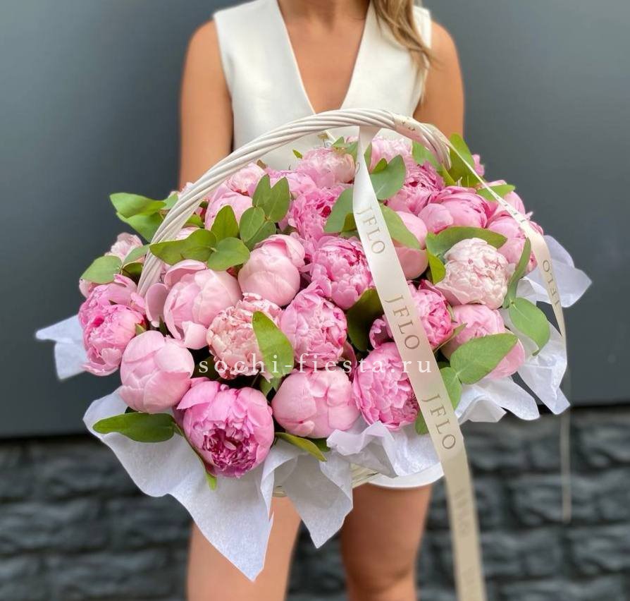 29 пионов, эвкалипт, корзина, лента.