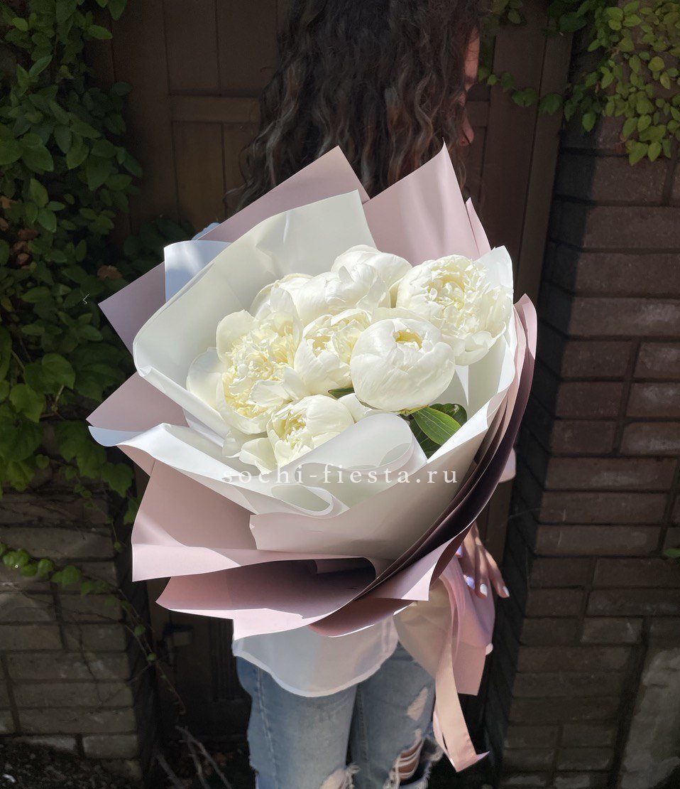 Девять белых пионов с пышными бутонами образуют монохромную композицию. Чистота линий и сдержанная упаковка подчёркивают природную красоту цветов.