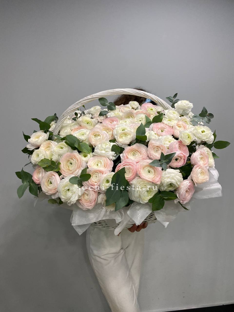 Двадцать пять розовых ранункулюсов раскрываются пышными головками, создавая воздушное облако из многослойных лепестков. Страусиные перья добавляют композиции графичности и легкости.
