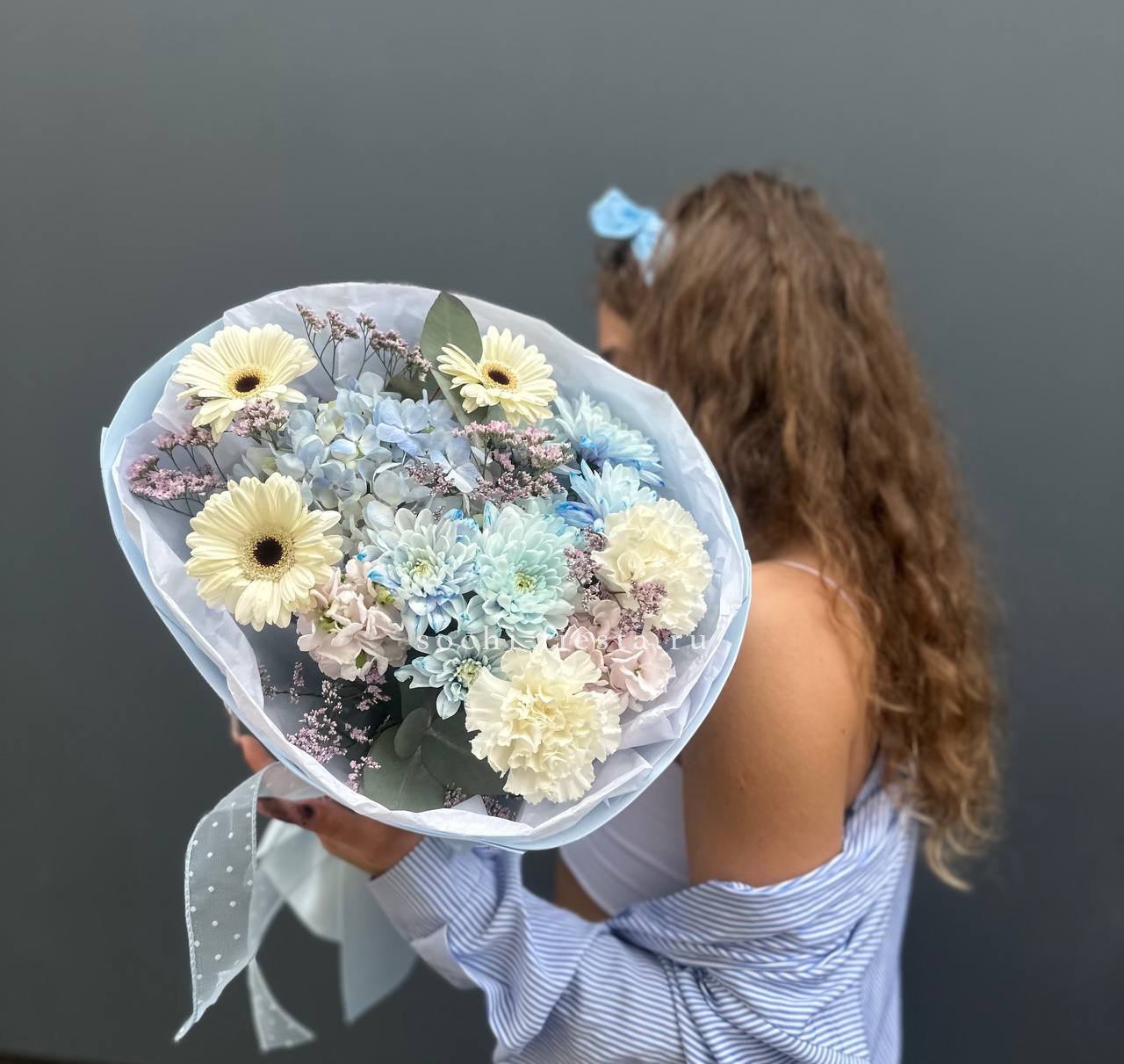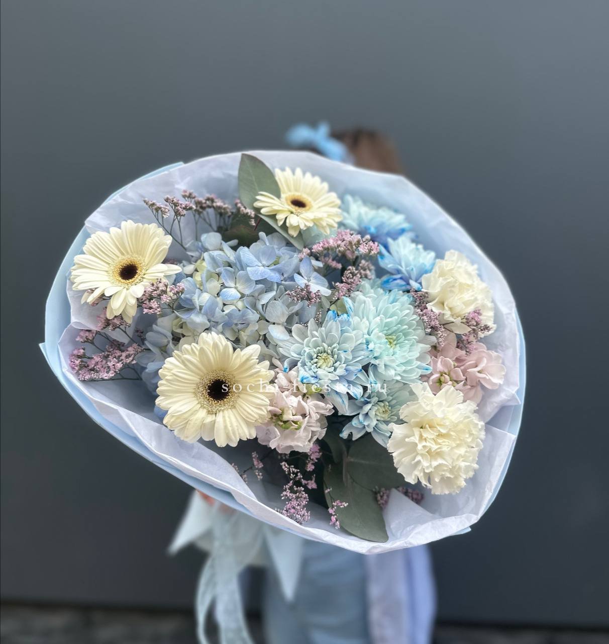 голубая хризантема, розовые розы, герберы, диантусы, лимониум, лента и дизайнерская упаковка бабочка.