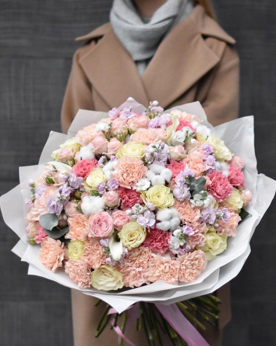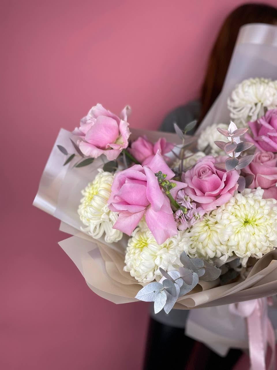 розы, диантусы, пионовидные кустовые розы, маттиола (или аналог вне сезона), эвкалипт, лента, крафт.