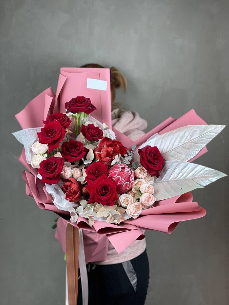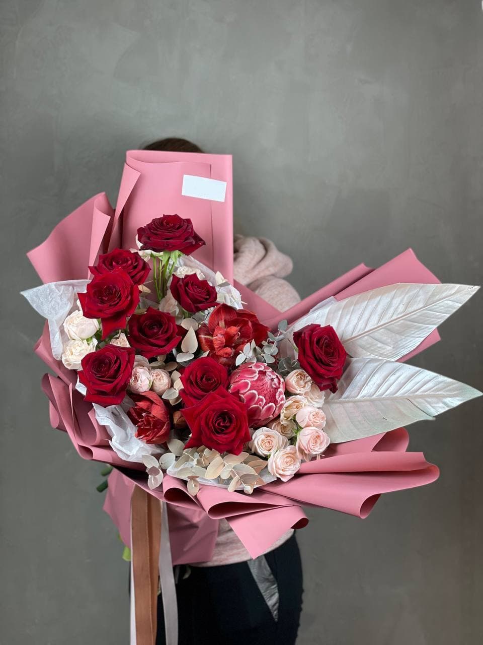 Глубокий красный перетекает из бархатистых роз в экзотичные соцветия протеи и амариллиса. Крупные листья стрелиции задают графичный ритм, а пионовидные бутоны добавляют объёма. Композиция для пространств с характером и выразительным вкусом.
