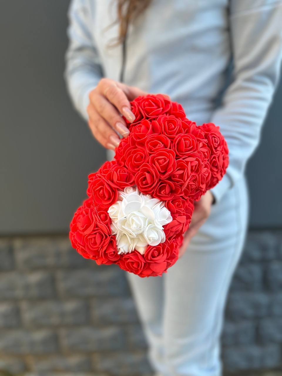 Красный медведь из фоамирана с объёмным белым сердцем в центре. Мягкие ровные ряды лепестков создают плотную текстуру, а контрастная вставка добавляет выразительности силуэту.