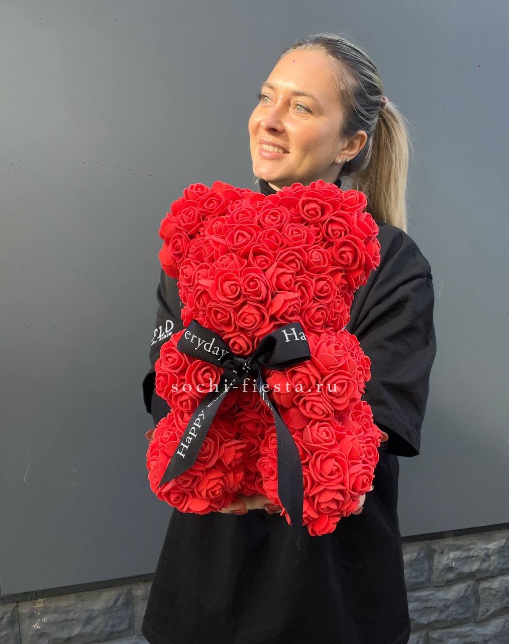 Фигурка медведя собрана из бутонов насыщенного алого оттенка. Каждый лепесток из фоамирана сохраняет форму и цвет без изменений. Компактная композиция для тех, кто ценит долговечность.