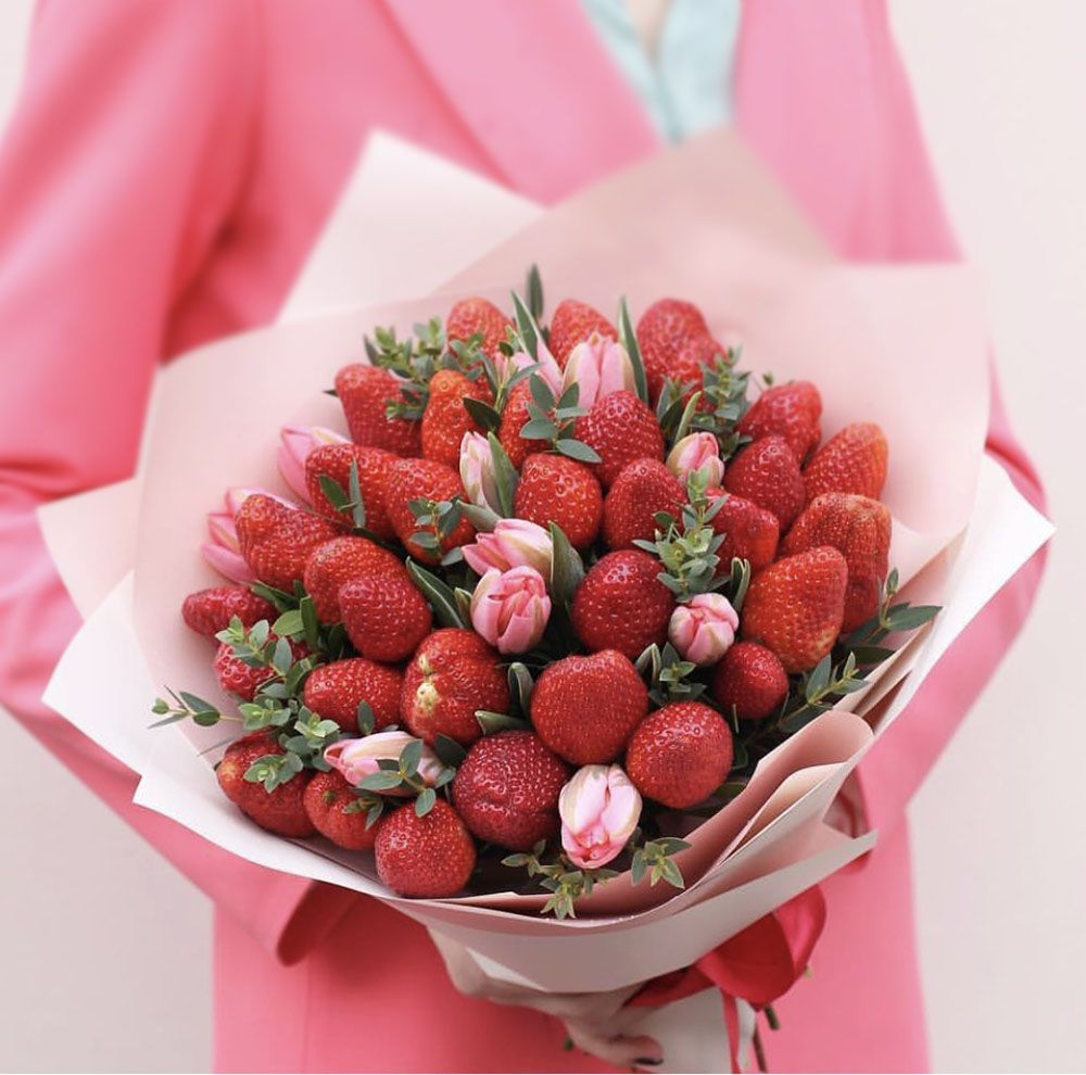 400-500г. ароматной клубники, 10 тюльпанов, лента, дизайнерская бумага.