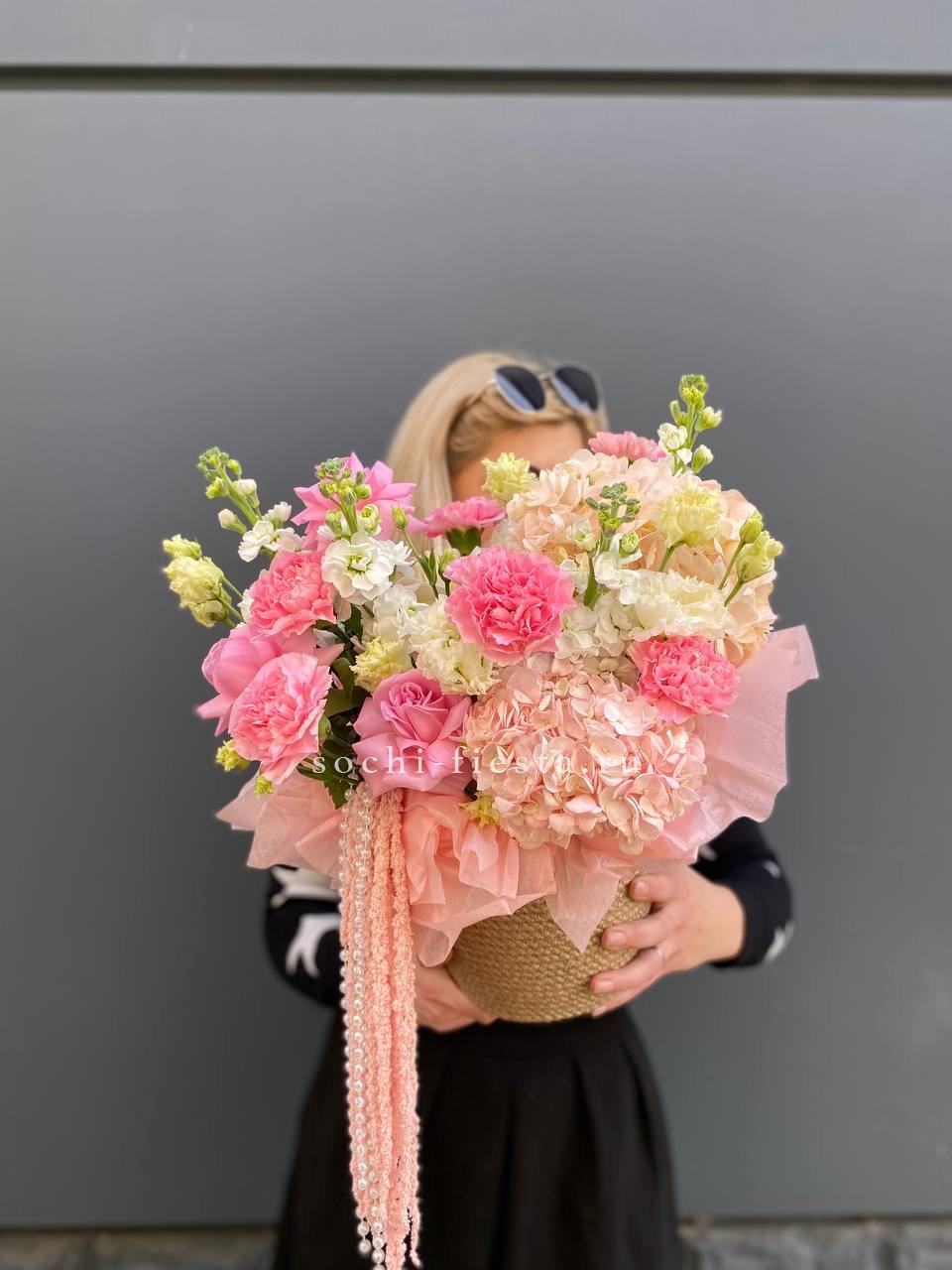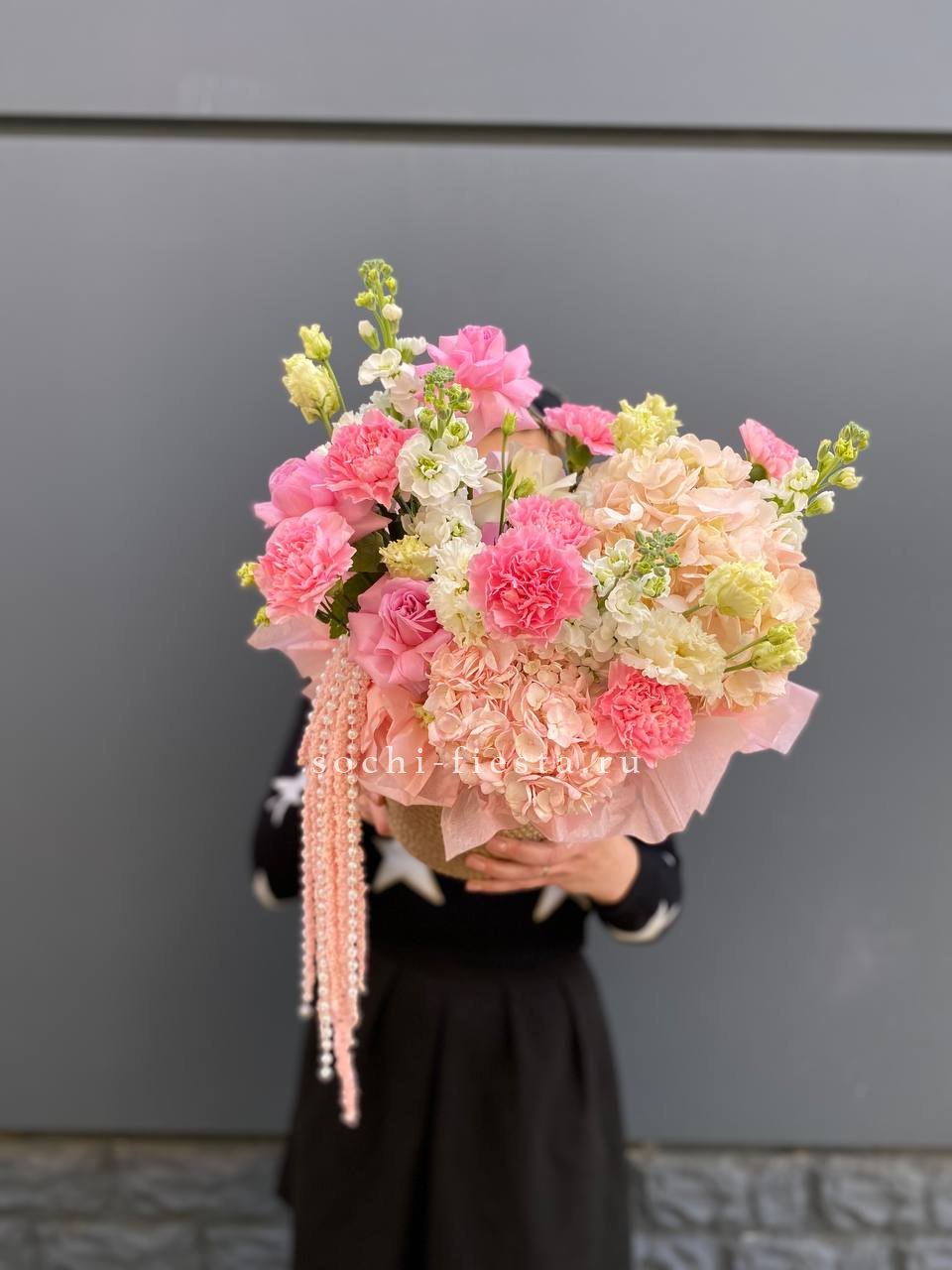 гортензия, диантус, розовые розы, маттиола, эустома, амарант, бусы (возможна замена), джутовое кашпо.