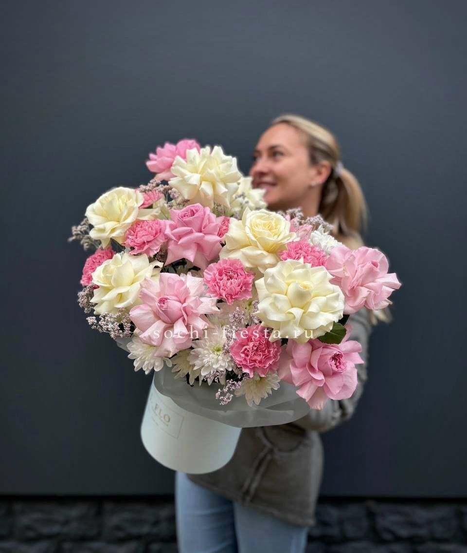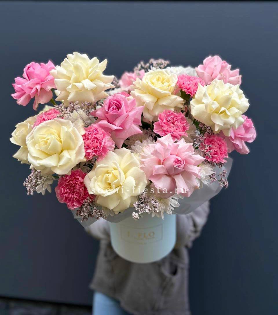 Для заказа товара "Коробка французских роз и диантусов "Бони"" с доставкой в Махачкале нажмите в корзину