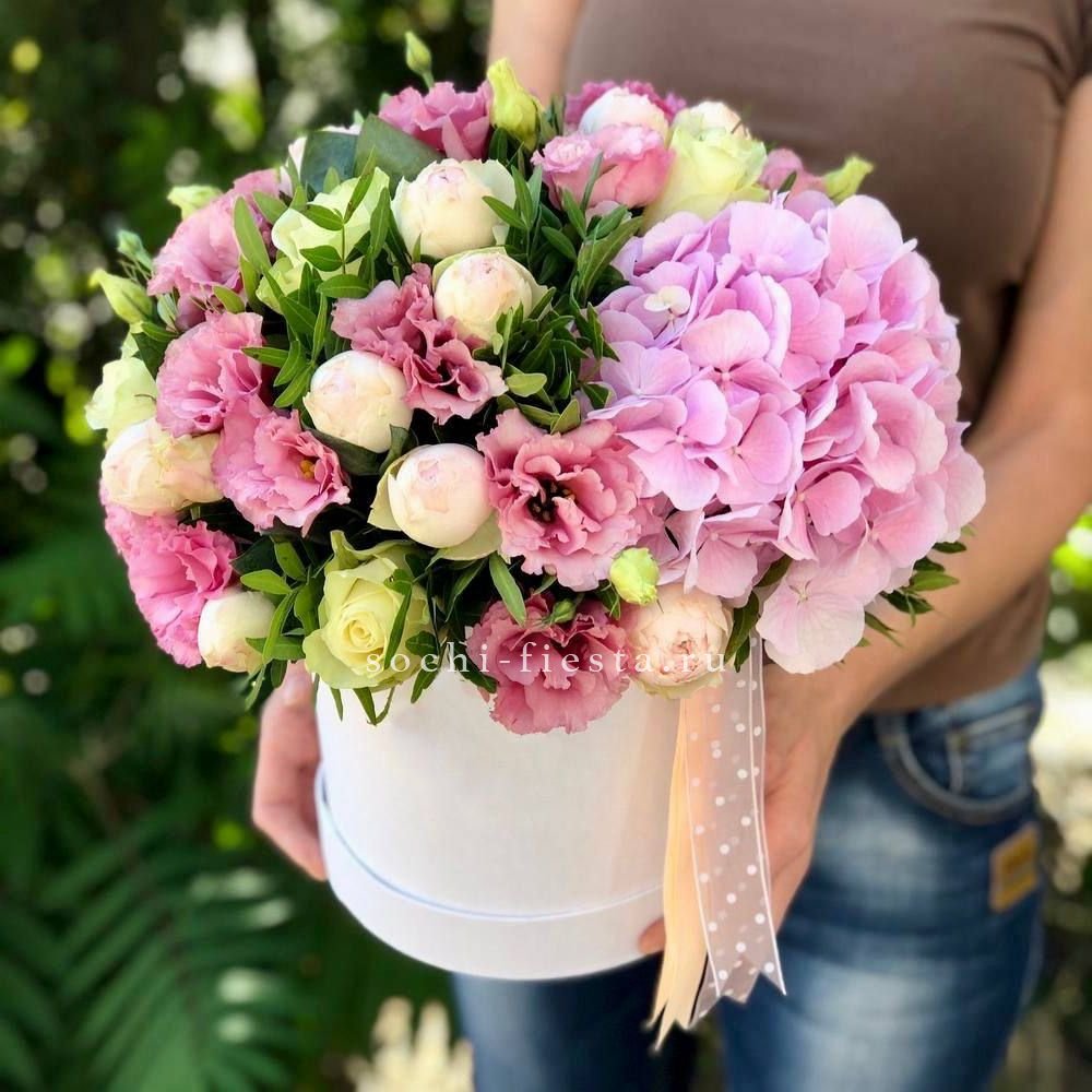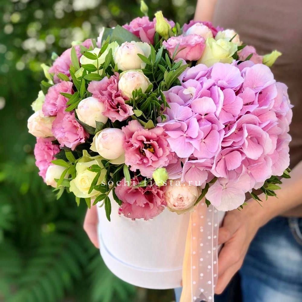 гортензия, кустовые розы, белые розы, эустома, диантусы, озатамус, цилиндр D16, эвкалипт, лента.