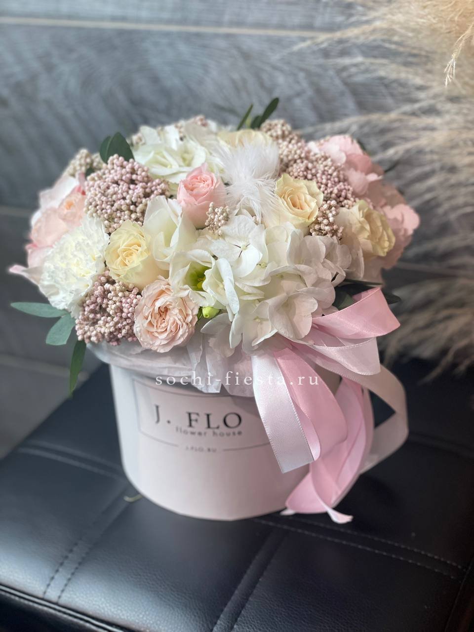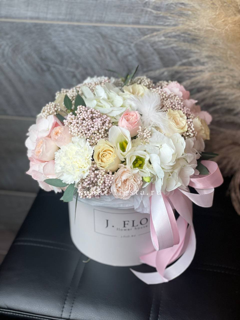 Белые розы и эустомы перекликаются с пастельными соцветиями гортензии, а озотамнус добавляет фактурные акценты. Эвкалипт обрамляет композицию серебристыми нотами.