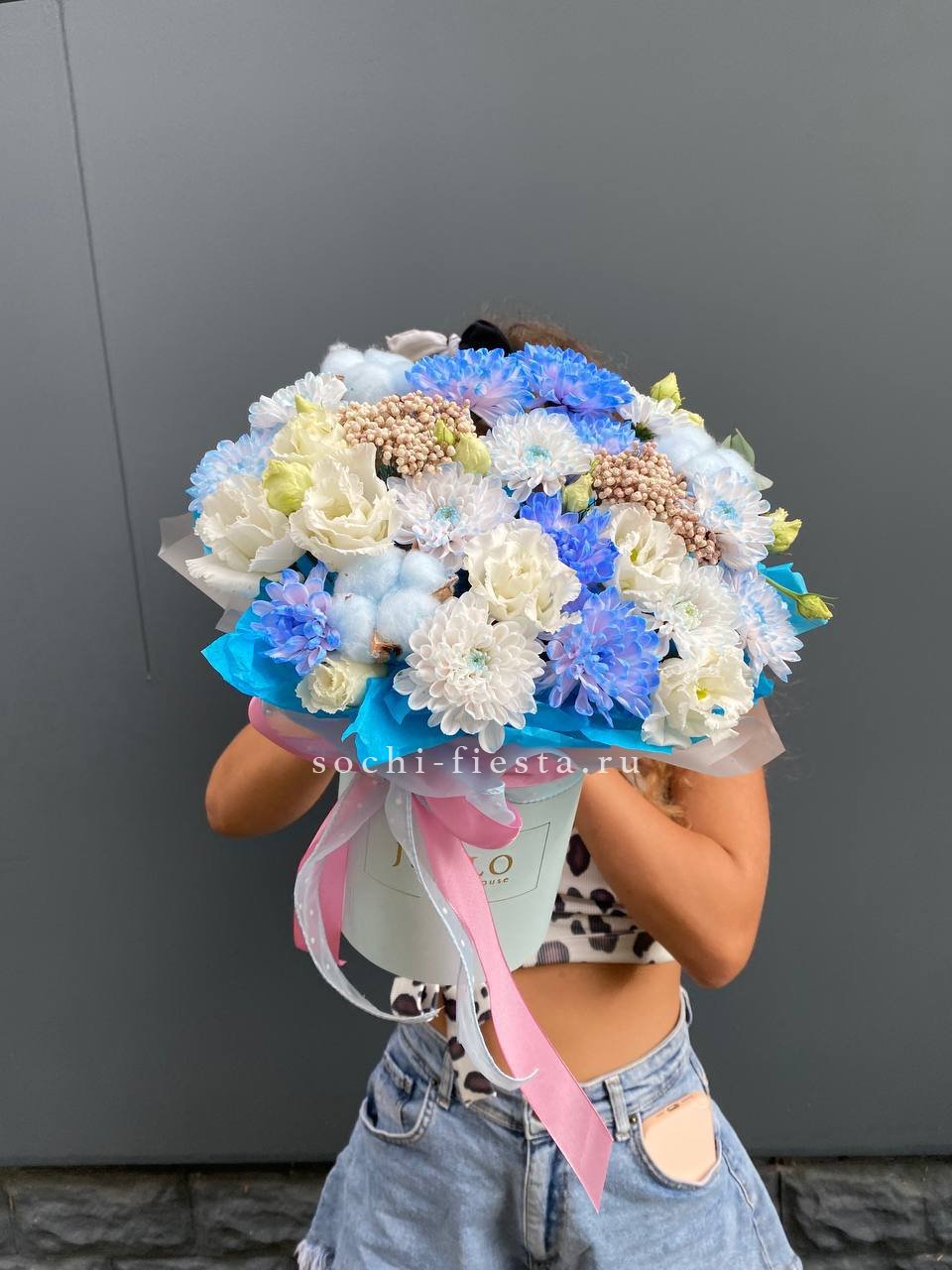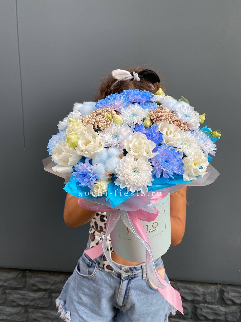 Хризнтема одноголовая, маттиола, диантус, тишью, коробка D13 Цвет коробки может быть согласован с заказчиком.