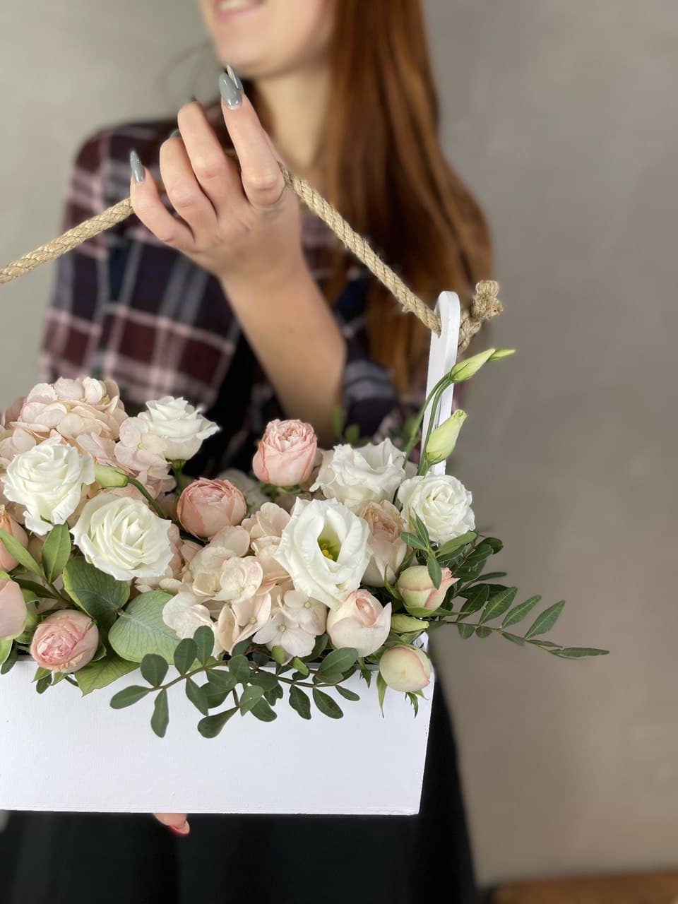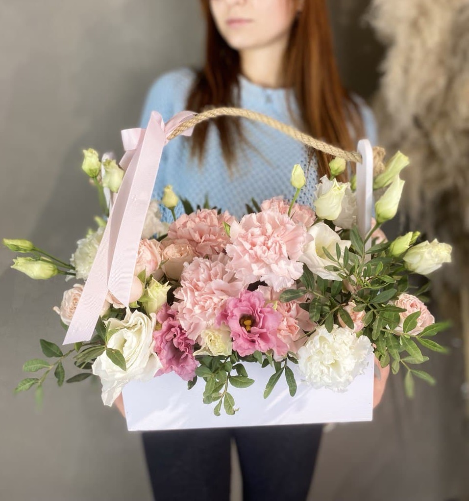 Композиция в деревянном ящике сочетает воздушную эустому с плотными головками роз и мелкими соцветиями диантуса. Фисташковый эвкалипт создает мягкую зеленую рамку вокруг цветочного наполнения.