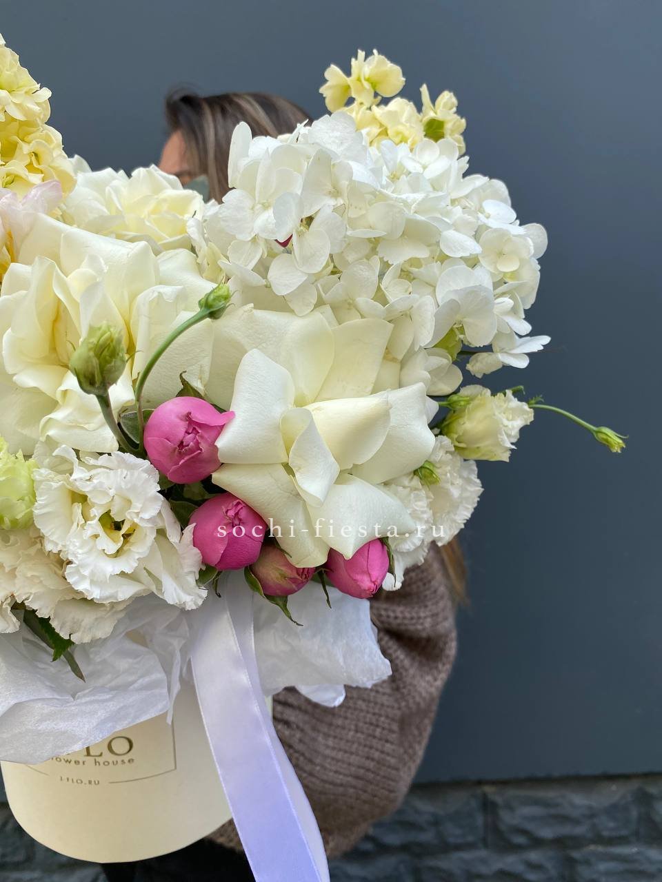 Французские розы раскрываются крупными бутонами рядом с воздушной эустомой и пушистой гортензией. Маттиола наполняет композицию тонким ароматом.