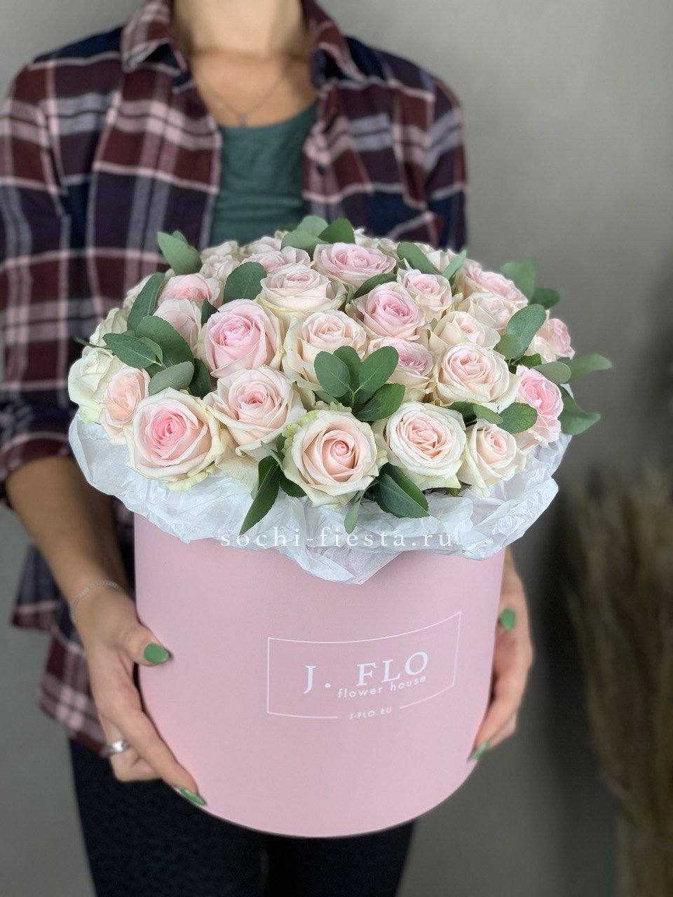 Воздушная композиция в пастельной гамме с акцентом на фактуру раскрытых бутонов. Пионовидные розы и эустома создают объёмный силуэт, а хлопок добавляет графичности.