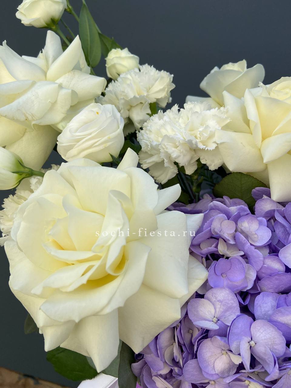эустома, пионовидная кустовая роза, белая роза, хлопок, эвкалипт, бокс 13.
