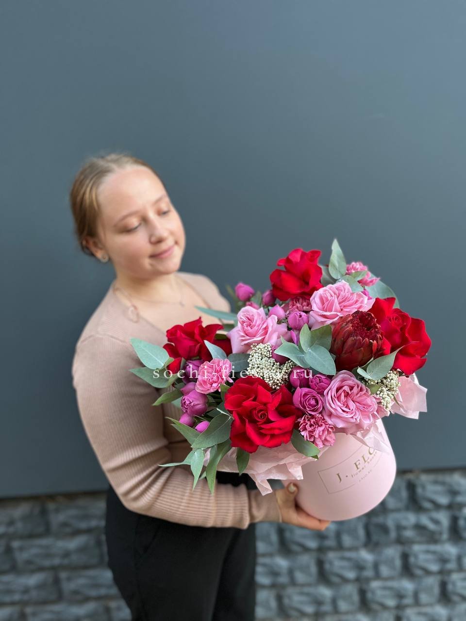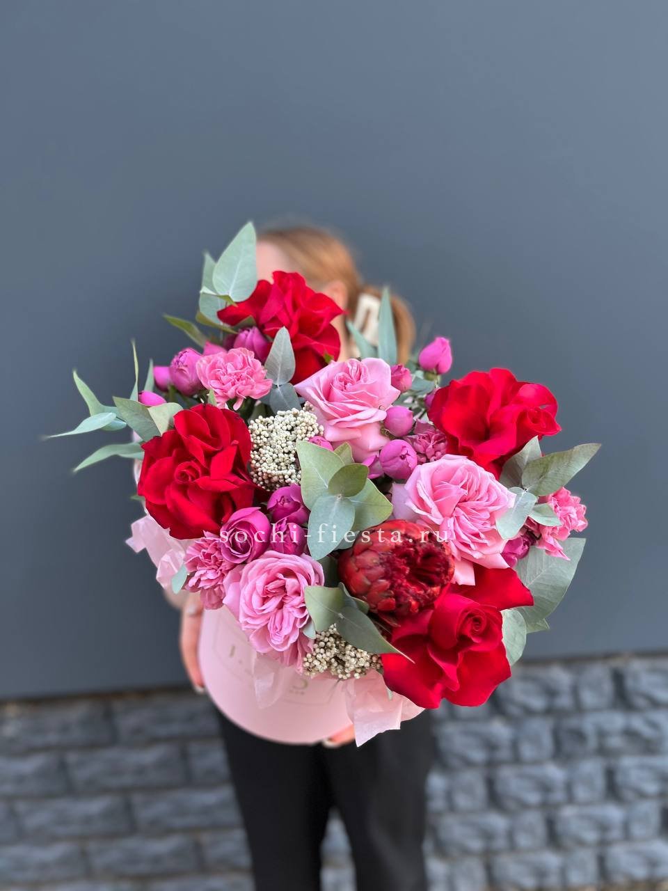 красная и розовая роза, озатамус, диантус, мисти баблс, эвкалипт, бокс 20.