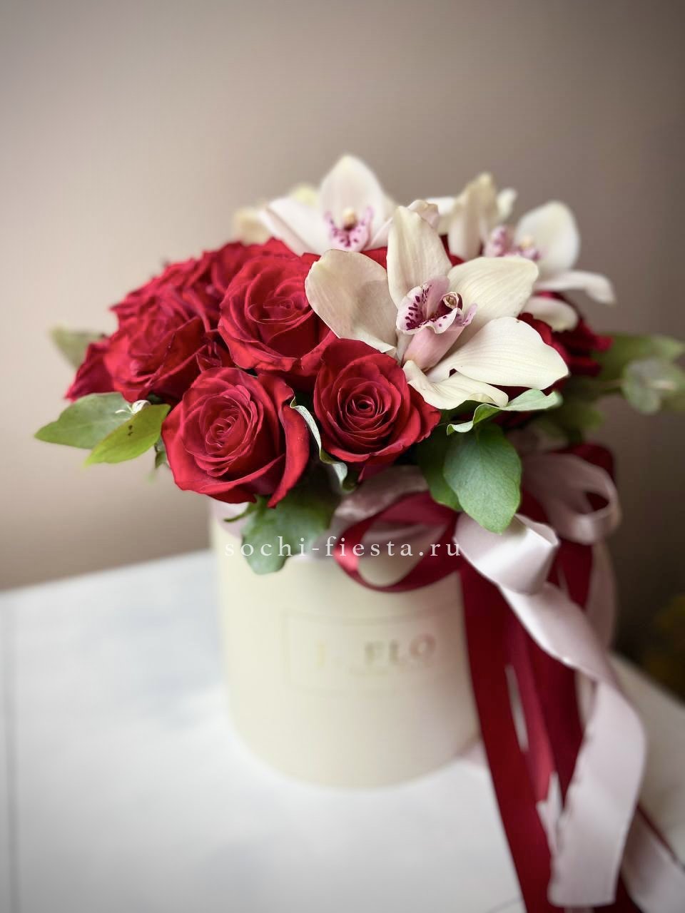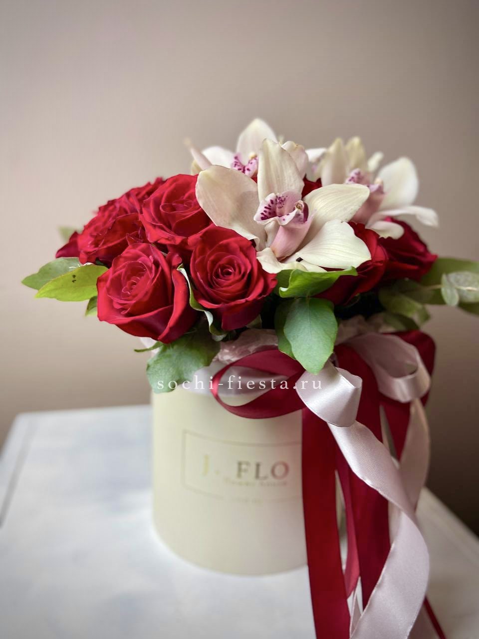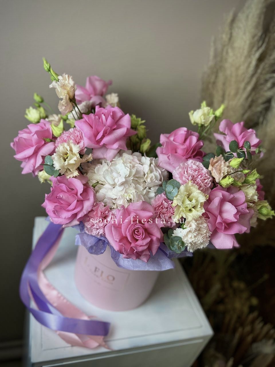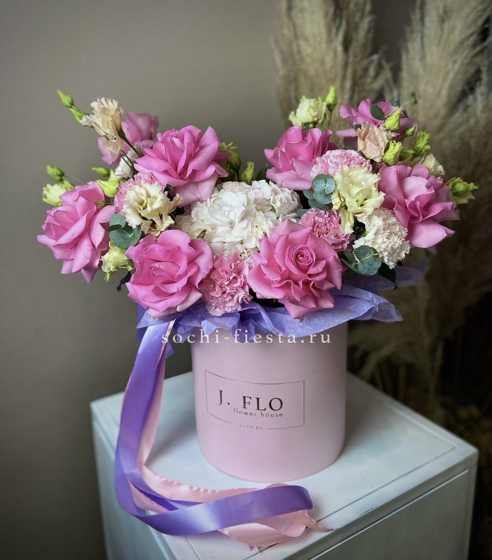 Цилиндр собран из пионов, роз и эустомы с добавлением диантусов и альстромерии. Амарант и эвкалипт создают объёмную текстуру. Композиция выразительна и хорошо держит форму.