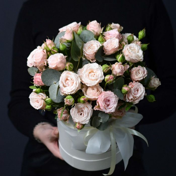 Кустовые розы собраны в плотную круглую форму и дополнены вертикальными стеблями вероники. Композиция в цилиндре выглядит графично и удерживает силуэт без дополнительных конструкций.