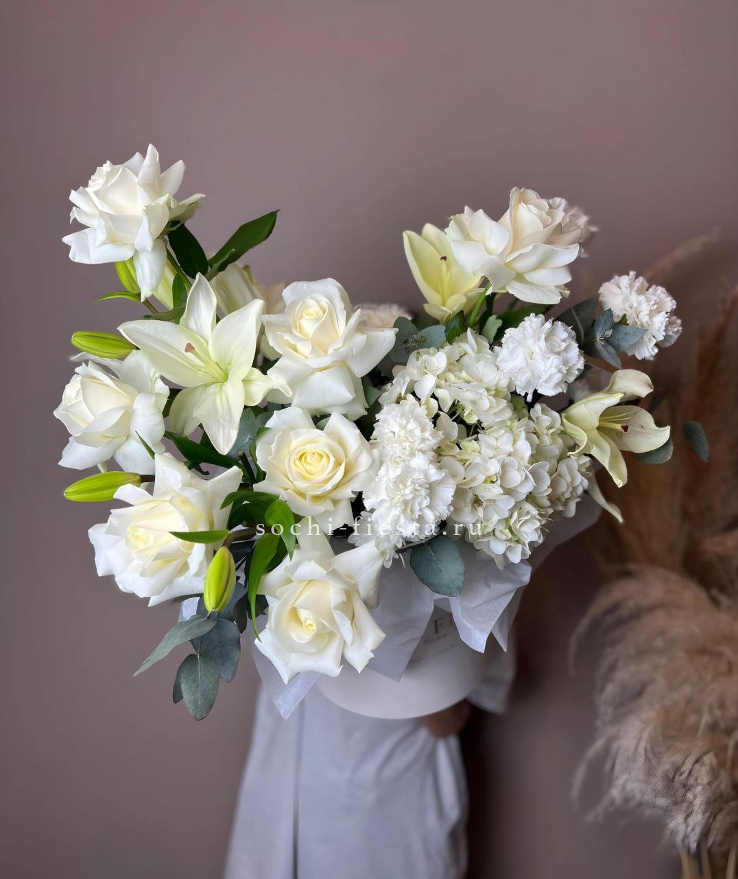 белые розы, диантусы, герберы, эвкалипт, бокс 20.