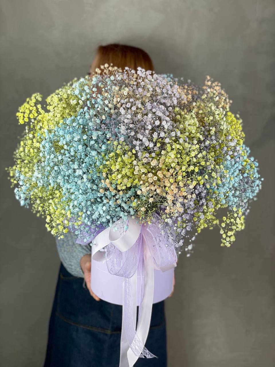 Двадцать пять стеблей гипсофилы в радужной палитре создают легкое облако цвета. Каждый оттенок переходит в следующий, наполняя пространство игрой света и воздуха.