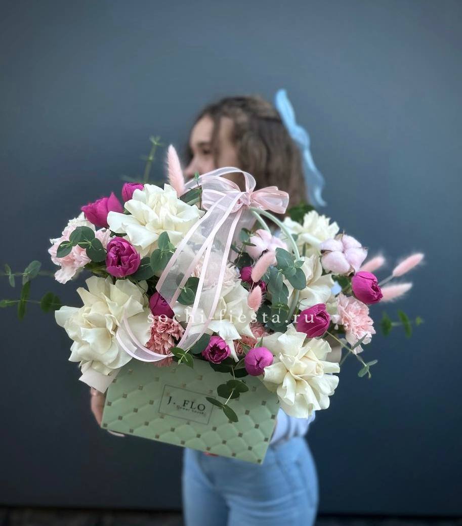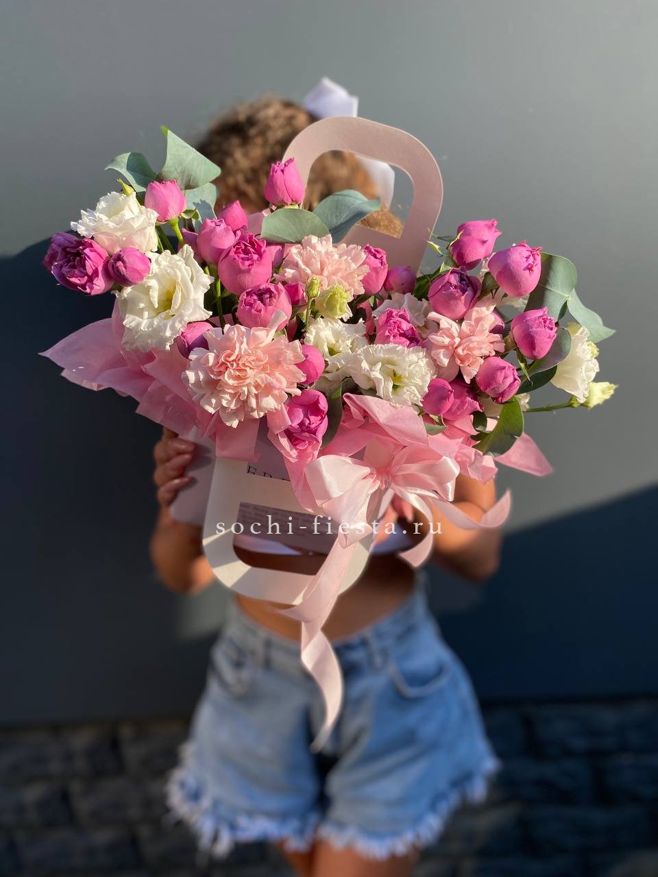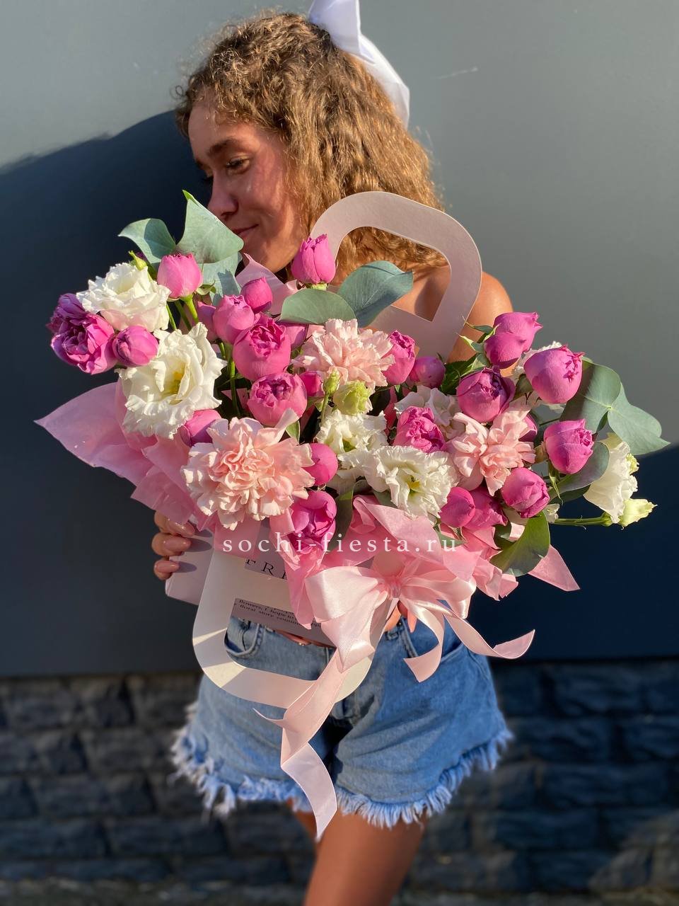 Розовые розы встречаются с орхидеей цимбидиум в объемной сумке-кашпо. Эустома и диантус создают многослойность, а кустовые розы заполняют пространство между крупными бутонами. Композиция держит форму и радует насыщенностью.