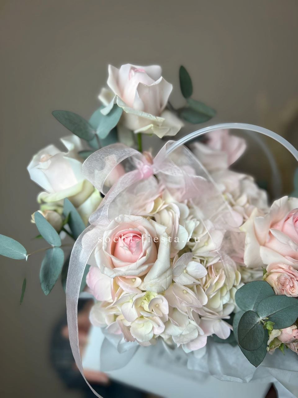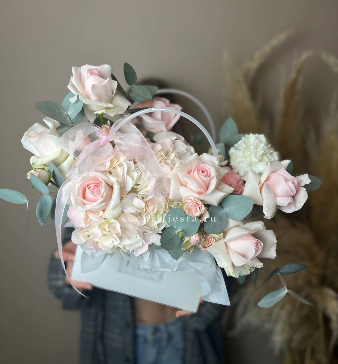 розовая роза, пионовидная роза, диантус, гортензия, эвкалипт, лента, сумка-кашпо.