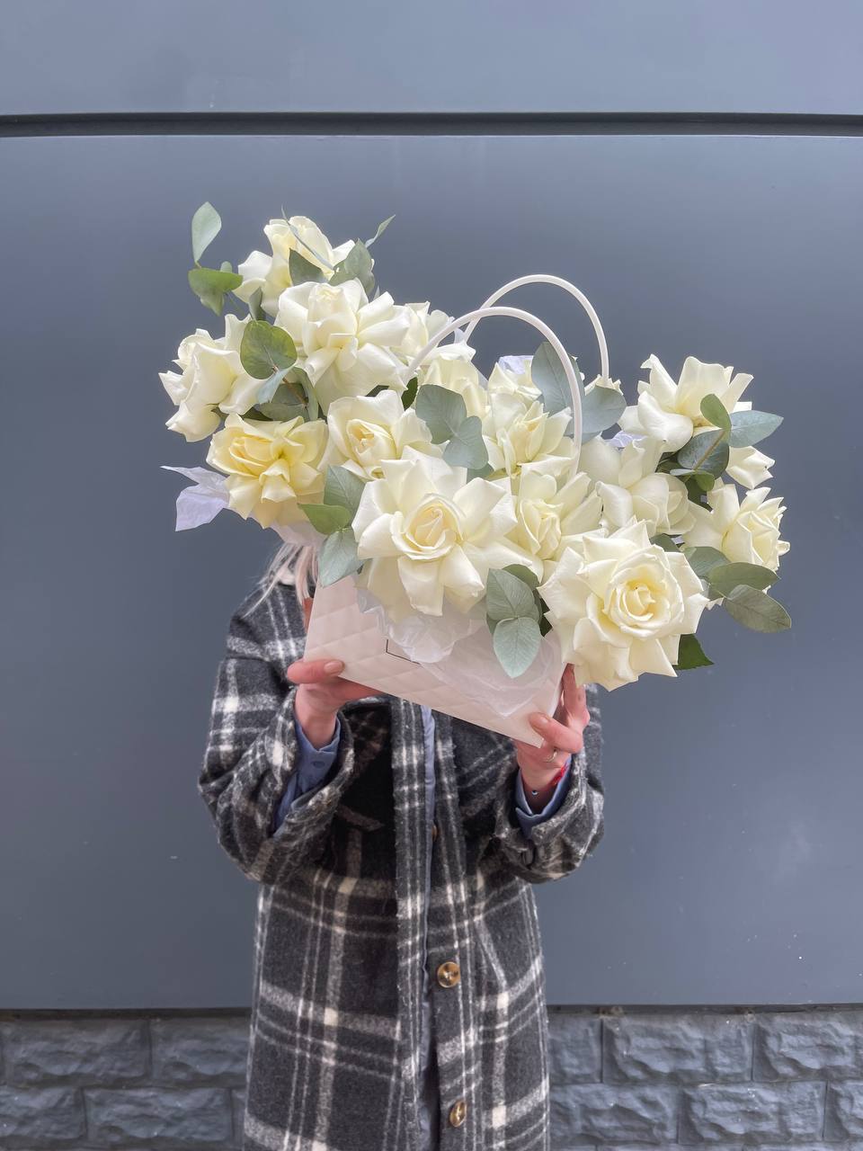 Воздушные головки диантусов собраны в компактную форму с мягкими переходами оттенков. Эвкалипт добавляет свежести и завершает композицию в удобной сумочке.