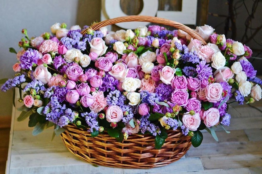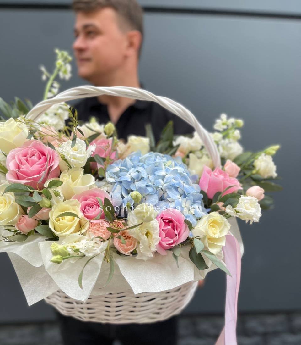 Пышная корзина с бархатными гортензиями и розами разных форм создает живописную композицию в романтичной гамме. Альстромерии и диантусы добавляют воздушности между крупными соцветиями.