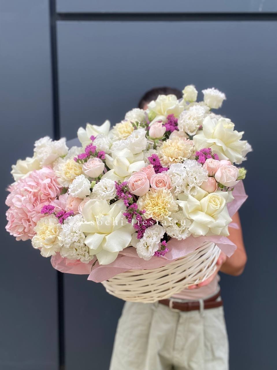 белые розы высокие в корзине.