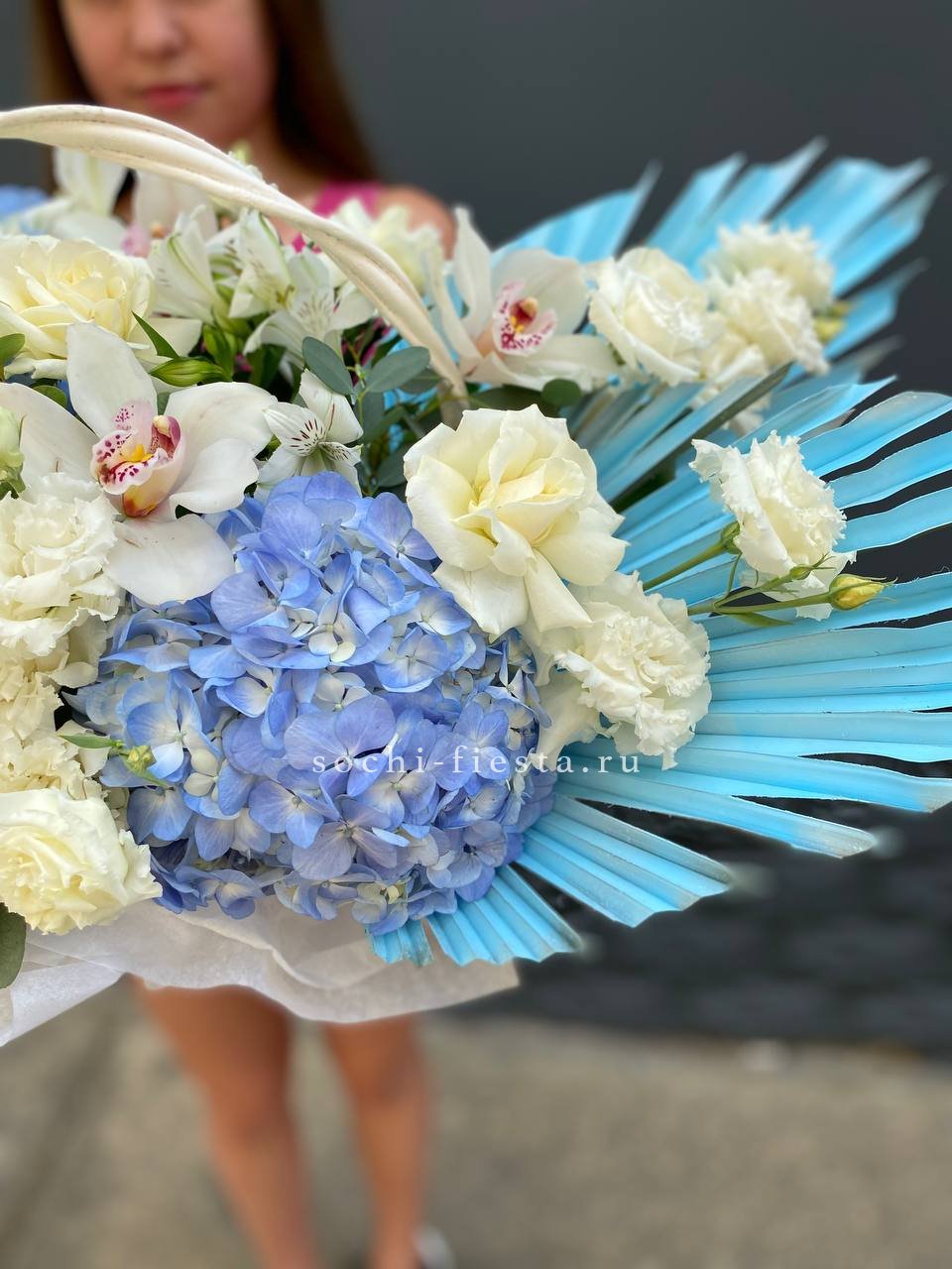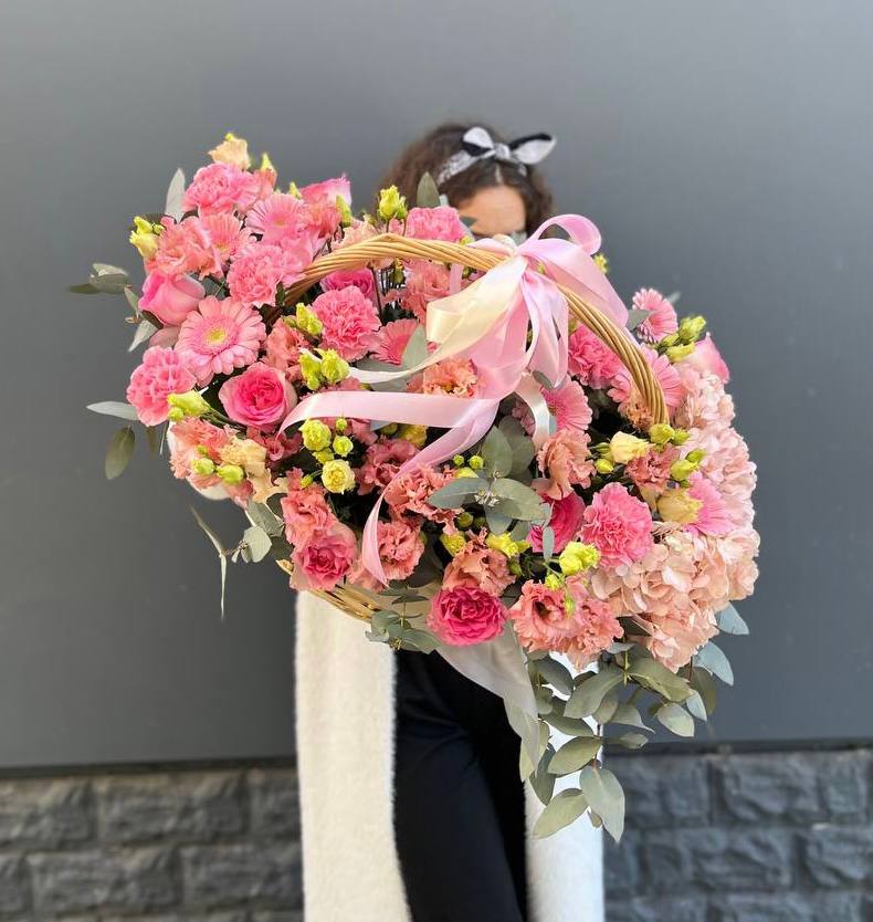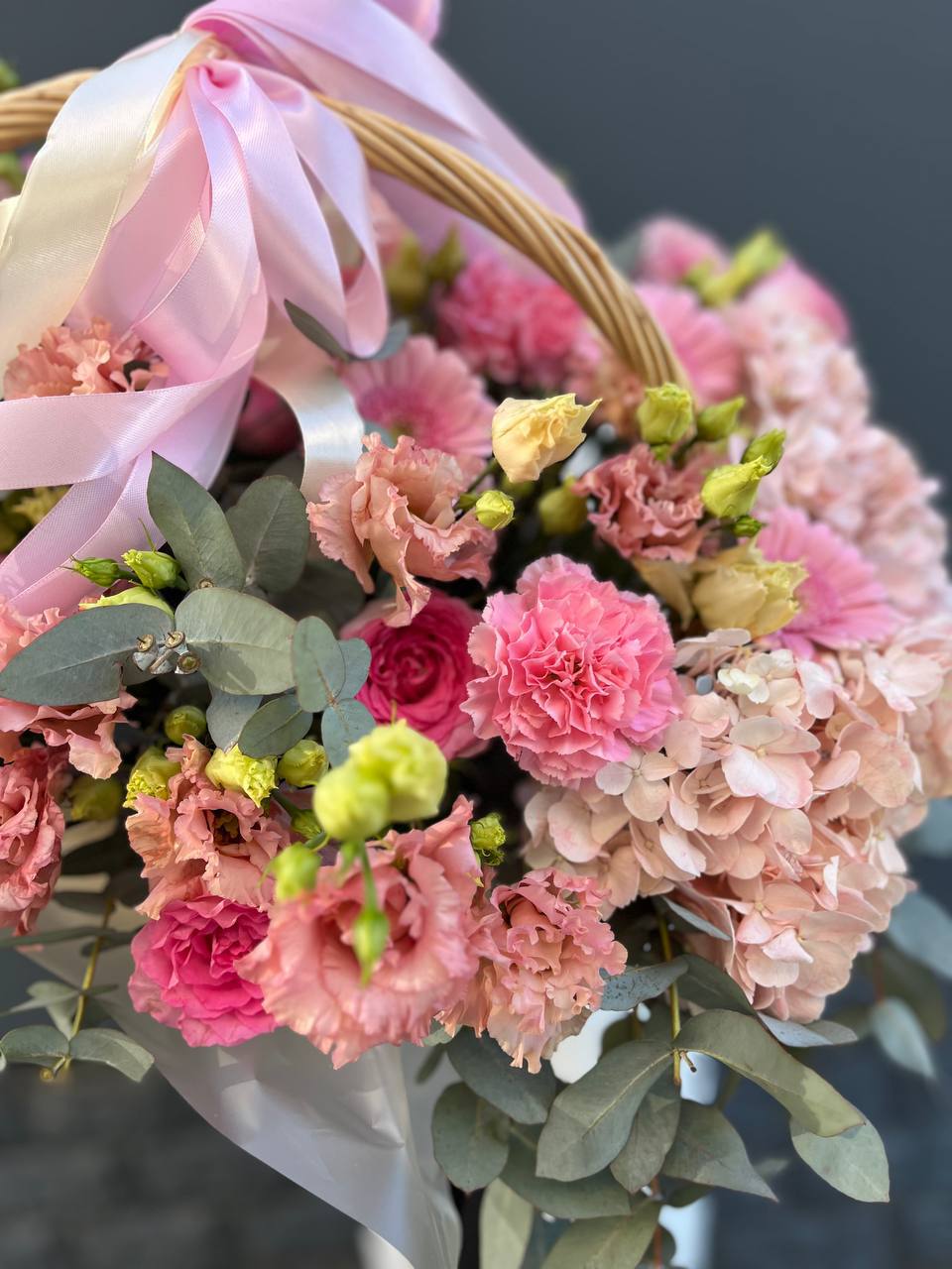 орхидея, гортензия, эустома, роза, эвкалипт, альстромерия, лента, корзина.