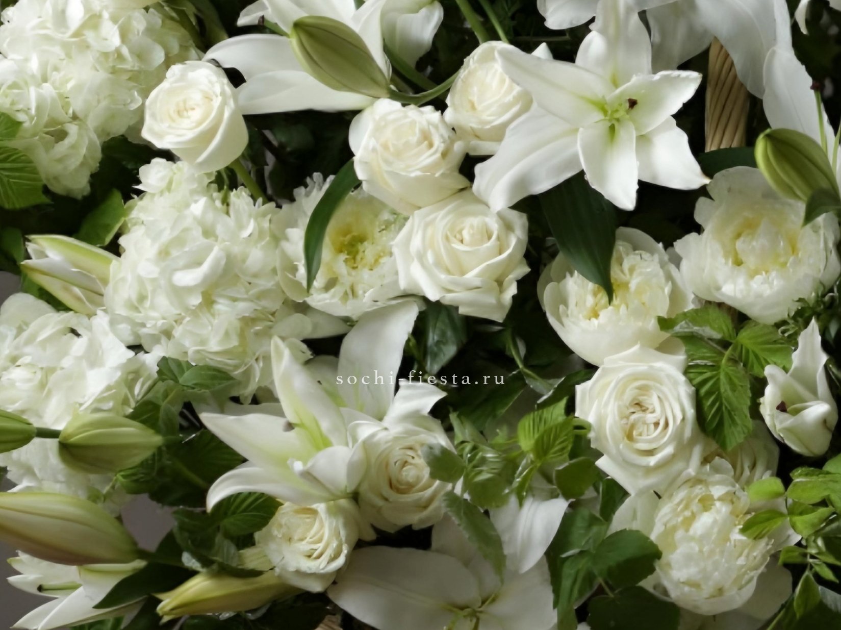 Пышная корзина с крупными бутонами роз, лилий и гортензий создаёт объёмную композицию с плавными переходами между соцветиями. Пионы добавляют воздушности и мягкости всей форме.
