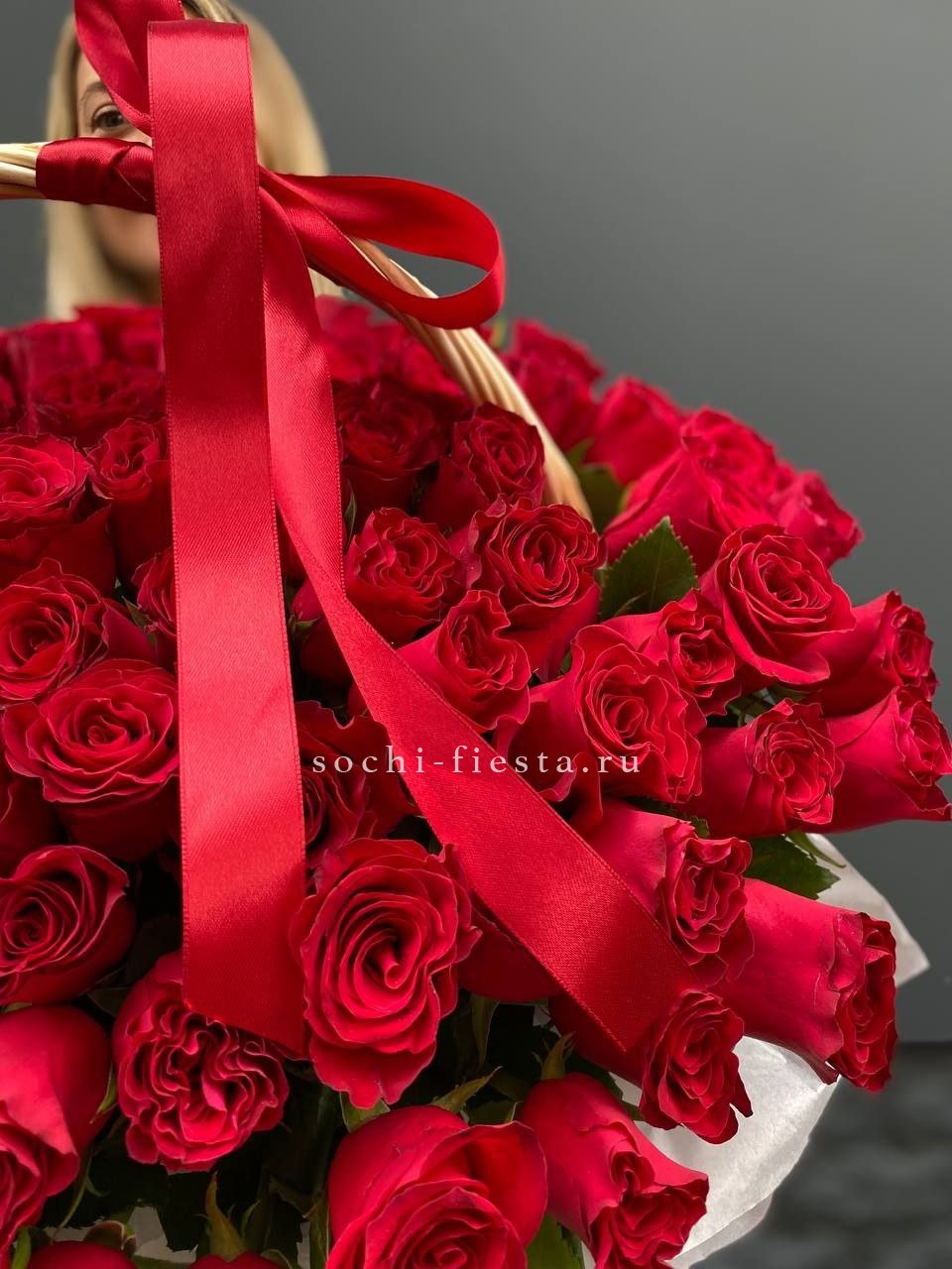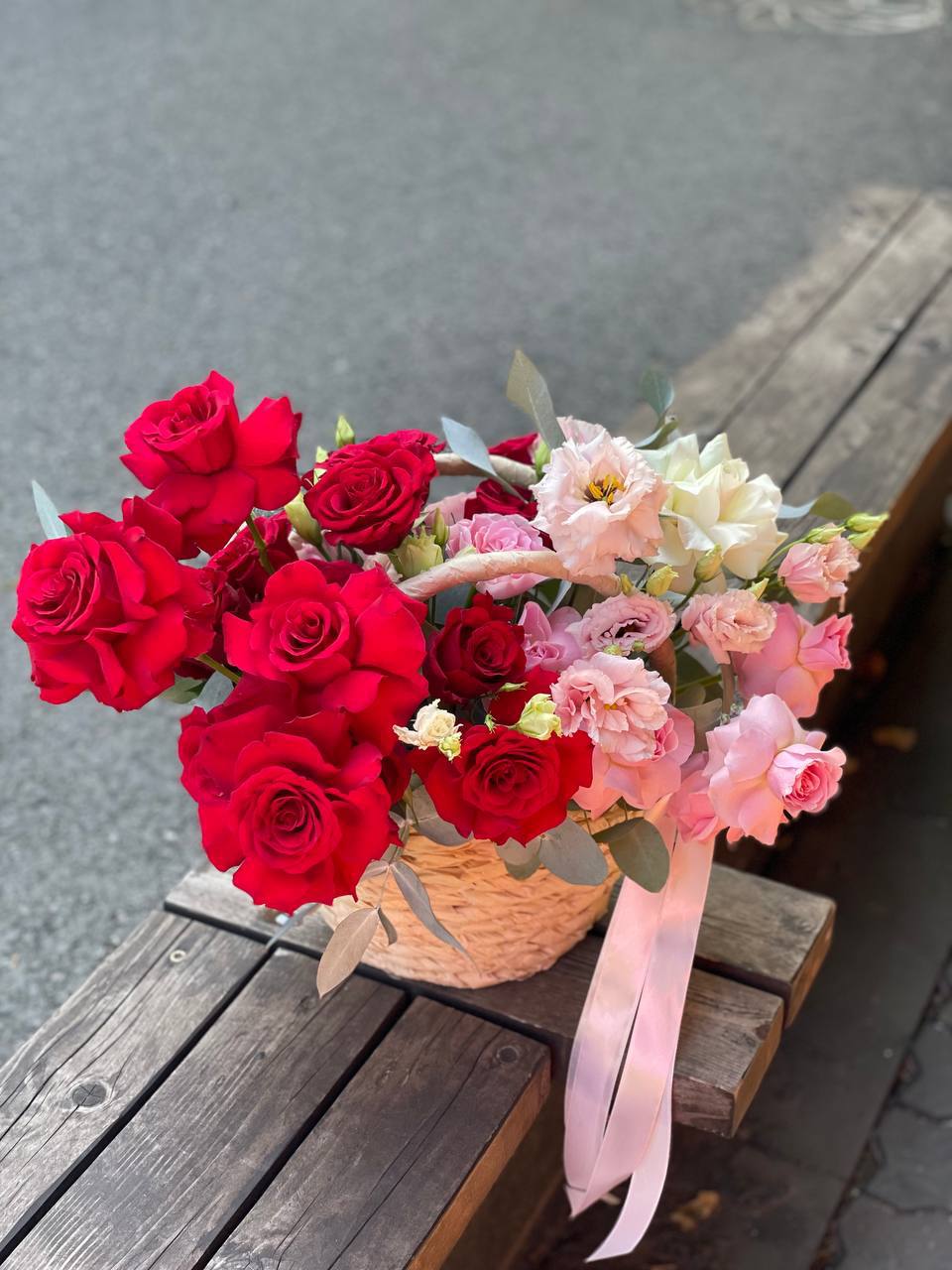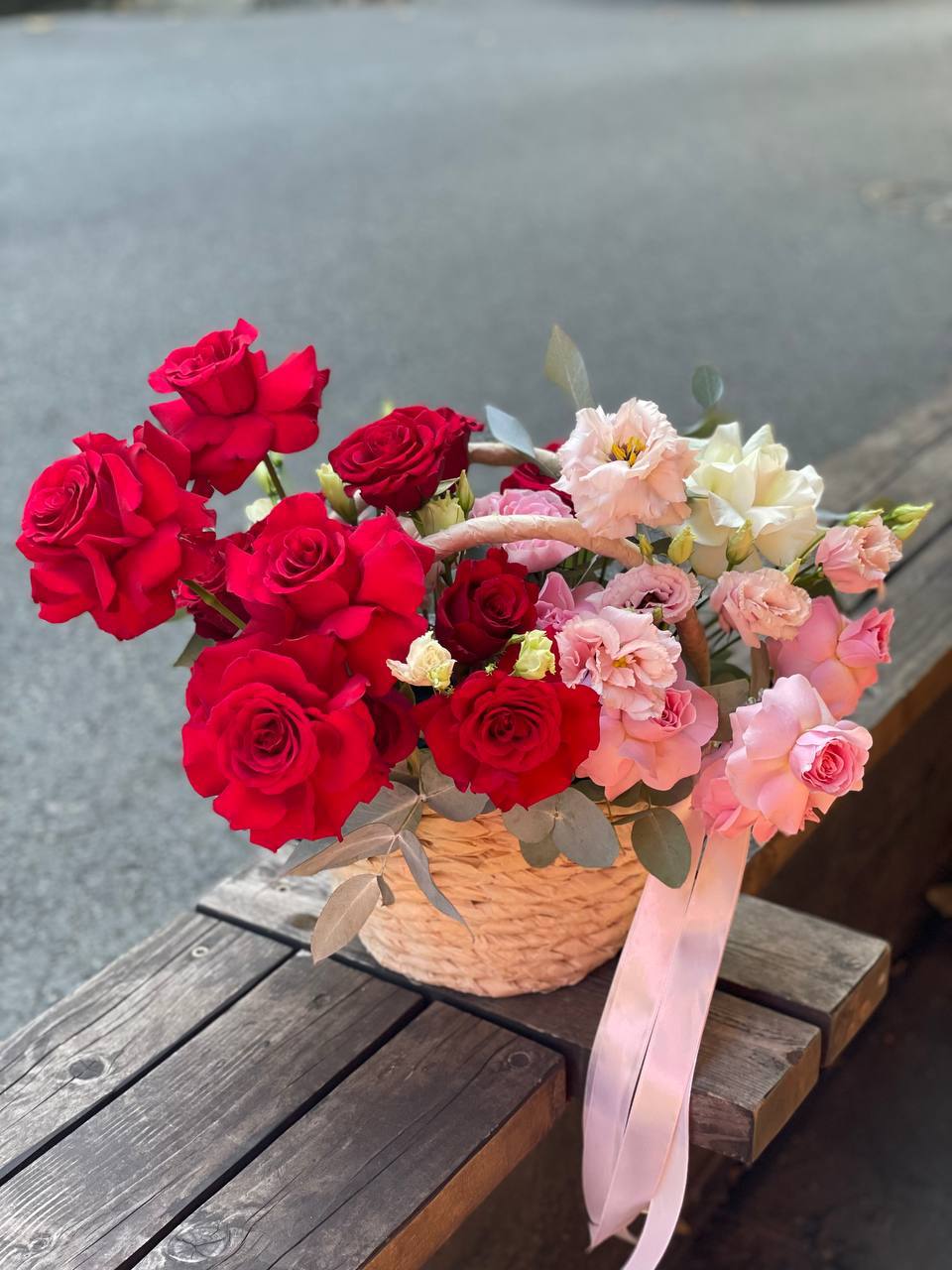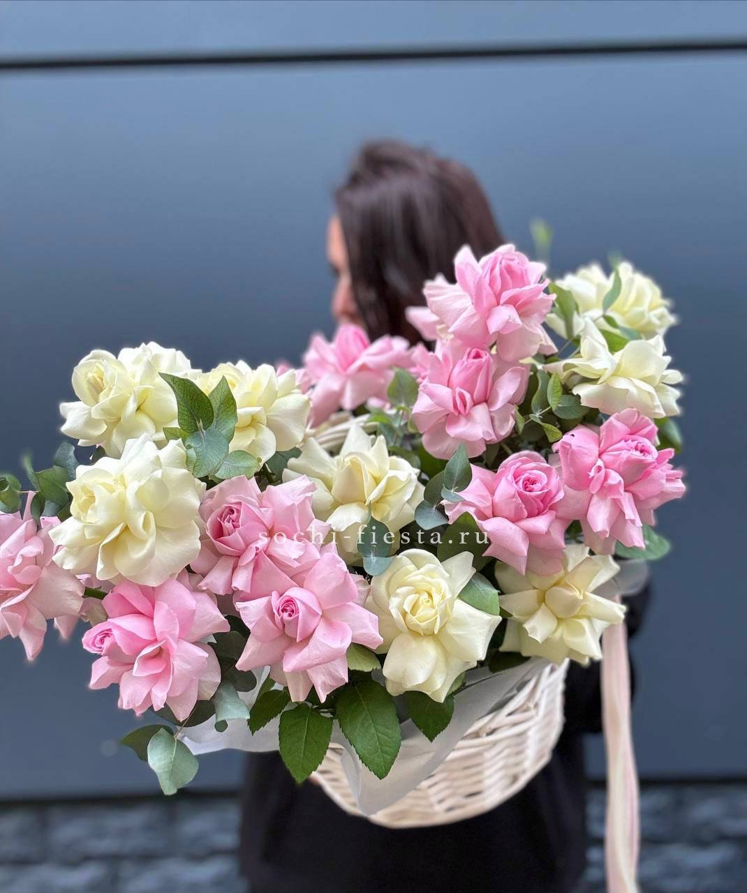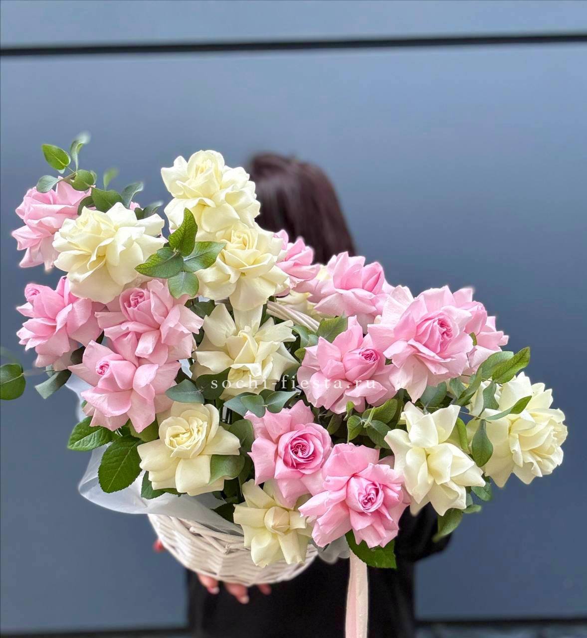 роза  французские - 25шт, эвкалипт, корзина.