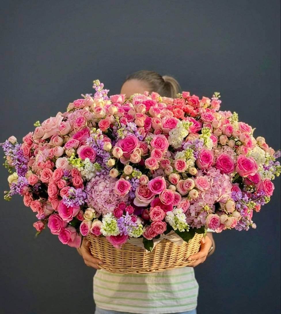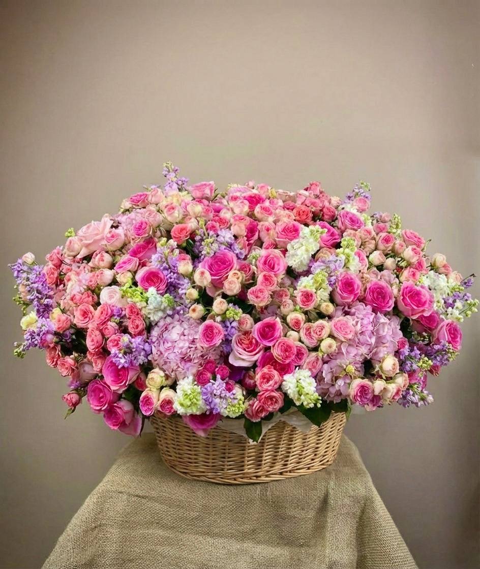 Пышная композиция в плетеной корзине объединяет розы, гортензию, эустому и дельфиниум в единую объемную форму. Маттиола и бомбастик добавляют воздушности, а эвкалипт создает мягкий природный фон. Корзина удобно располагается на любой поверхности и держит форму без дополнительной опоры.