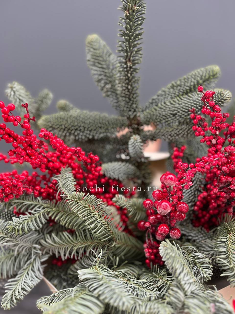 Живые ветви нобилиса переплетаются с красными ягодами илекса. Вертикальная сборка создаёт ритм между хвойной зеленью и ягодными гроздьями. Букет держит форму и долго сохраняет свежесть.