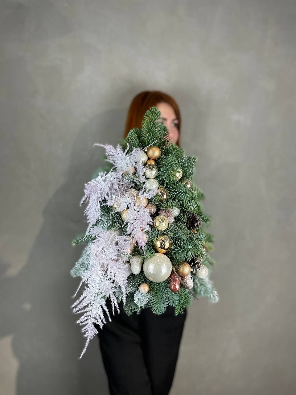Датский нобилис выстроен в форму небольшой ёлки с украшениями в тонах розового золота. Композиция размещена в кашпо и готова к установке на столе или комоде. Компактное праздничное решение.