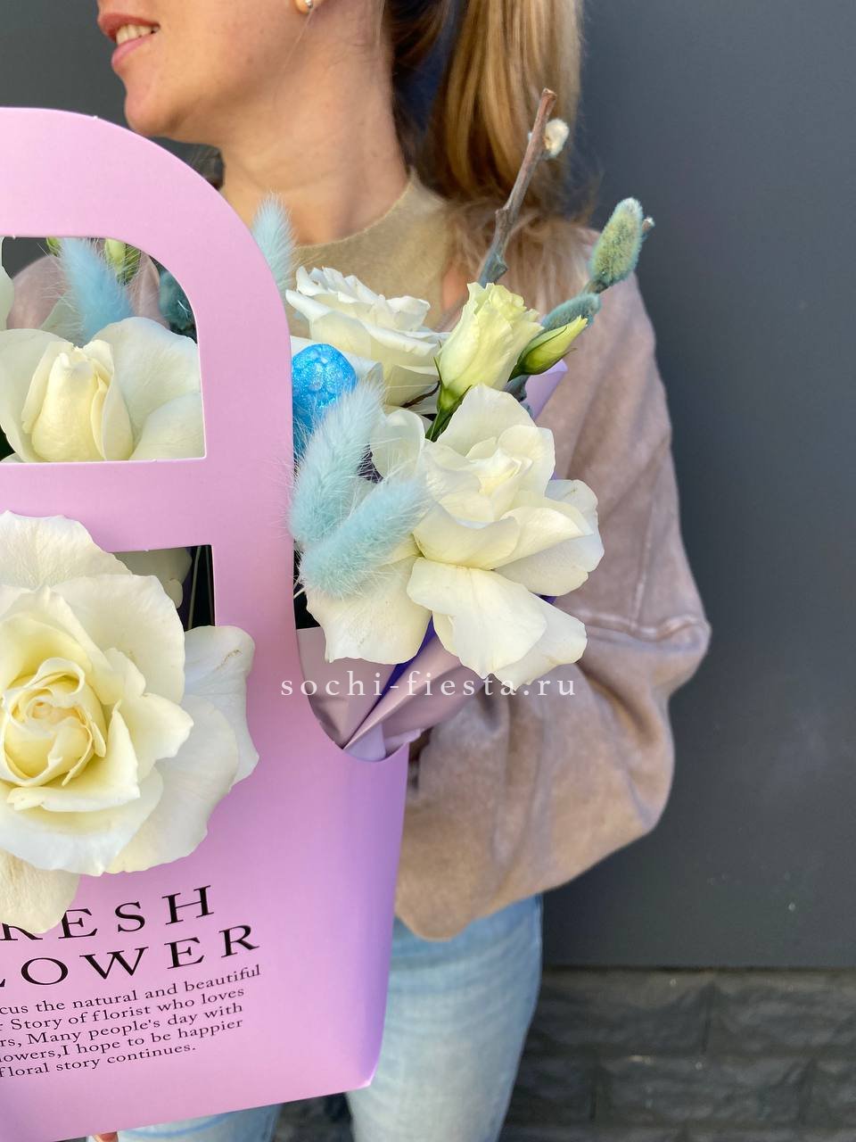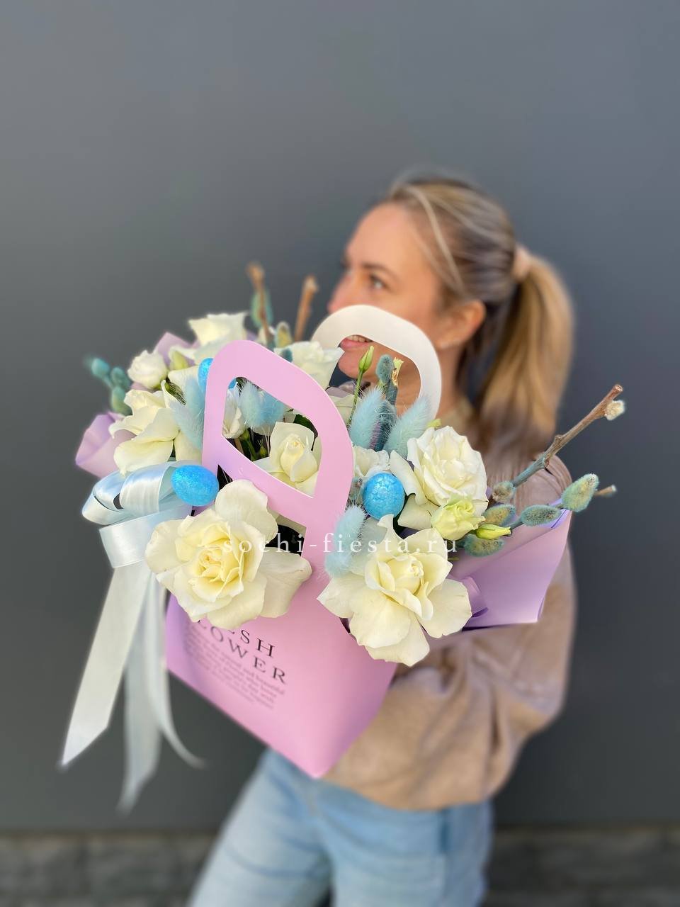 Белые розы собраны в компактную форму вместе с пушистым лагурусом и вербными ветками. Пасхальные яйца встроены в композицию как часть весеннего настроения. Сумочка удобна для размещения на столе.